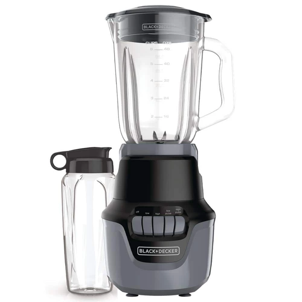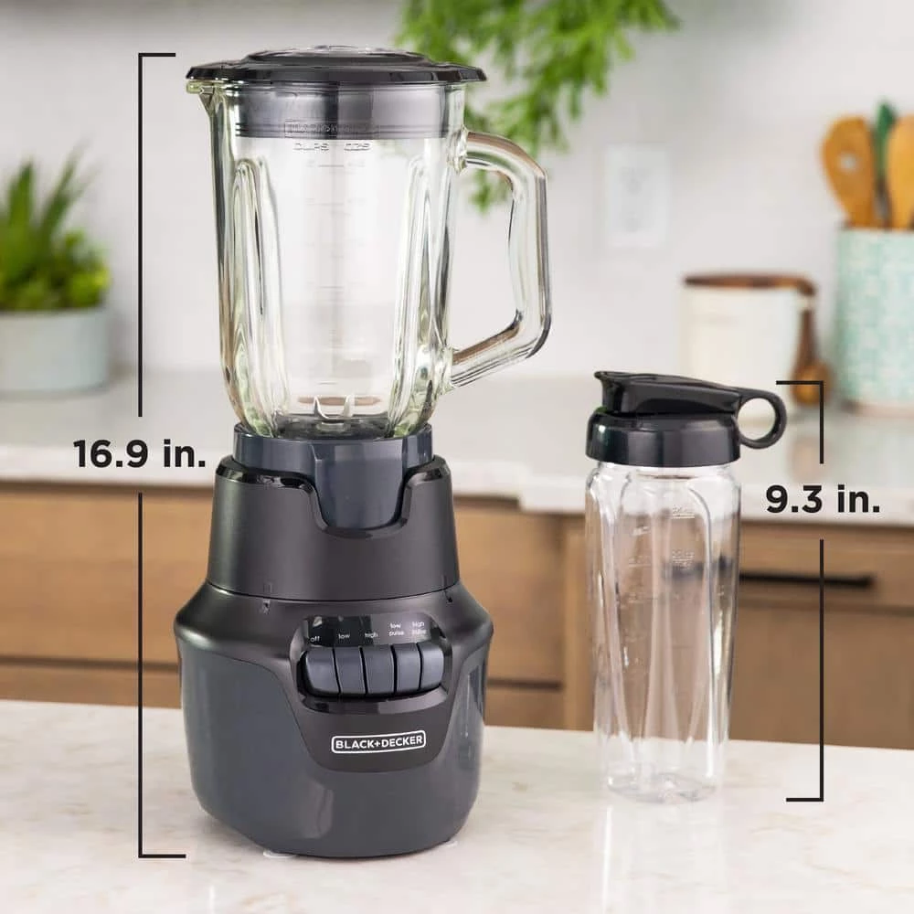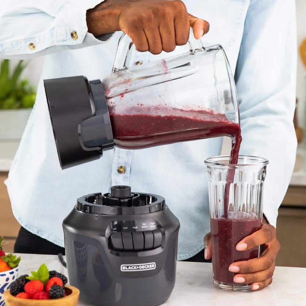 No more stopping, stirring, or shaking to clear jams in your blender. The BLACK+DECKER Performance Helix Blender features our exclusive Blade Boost Technology so you can blend up to 50 percent faster*. Simply press down on the blender jar to raise the blade height and break through air pockets and clogs, grabbing ingredients above and creating a powerful vortex-it’s that easy! Plus, with four speeds, including two pulse settings, a 4-tip stainless steel blade, and 800-watts of peak ice crushing power+, nothing can stand in its way. The 6-cup capacity PerfectPour glass blending jar and lid with built-in ingredient slot and measuring cap make this the perfect kitchen companion to create smoothies, purees, soups and more with ease. Take your creation on the go with the included personal jar. Once you’re finished, the removable parts of the blender are dishwasher safe for simple clean up.