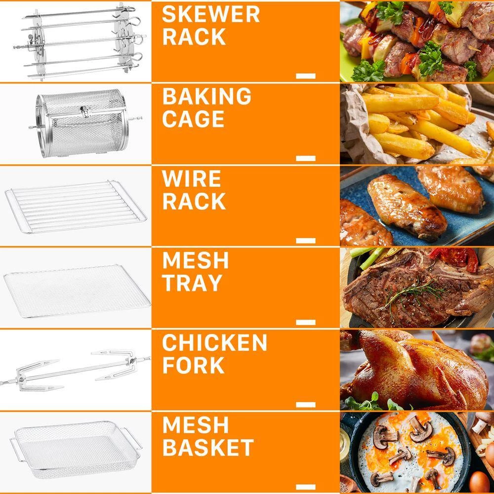 - Expanding Cooking Options : Come with 8 extra accessories: 1 Skewer rack/1 Baking cage/1 Wire rack/1 Mesh basket/1 Mesh tray/ 1 drip tray that catches fat and oil, 1 Chicken fork to jab into the chicken or roast and 1 Cage tong, this air fryer can create more possibilities which means you’re able to cook more types delicious with the included recipe.fryer oven. Get started today to explore more delicious new cuisine.)