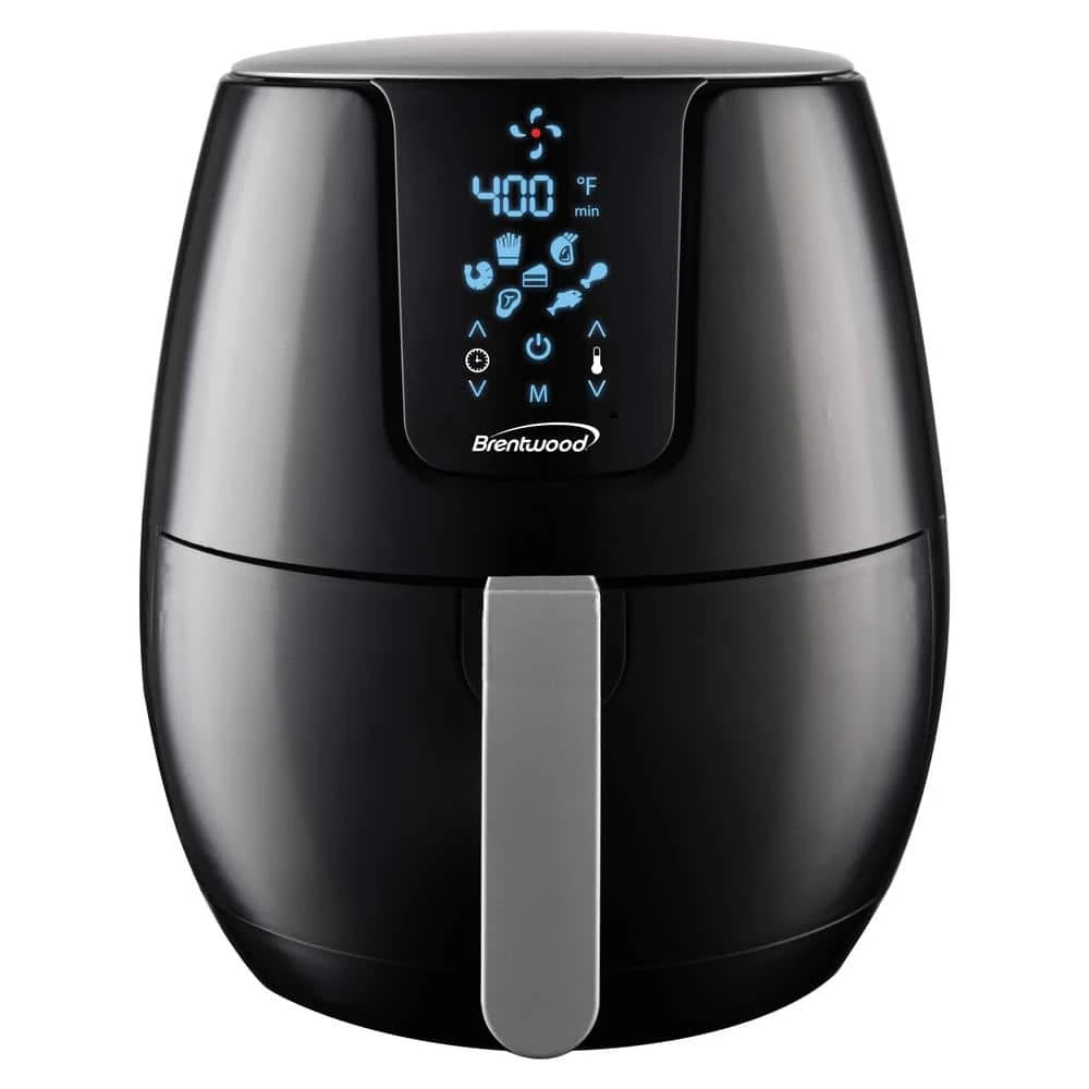 The powerful Brentwood 5-Qt. 1,400-Watt Electric Air Fryer fries quickly and evenly using little to no oil for families up to 5 persons. Make crispy french fries, onion rings, chicken wings, roasted veggies, and more. Use the quick temperature guide and 30-minute timer with auto shutoff for fast, crispy results. The cool-touch, removable fry basket makes serving a breeze. It has an easy-to-clean, nonstick surface.