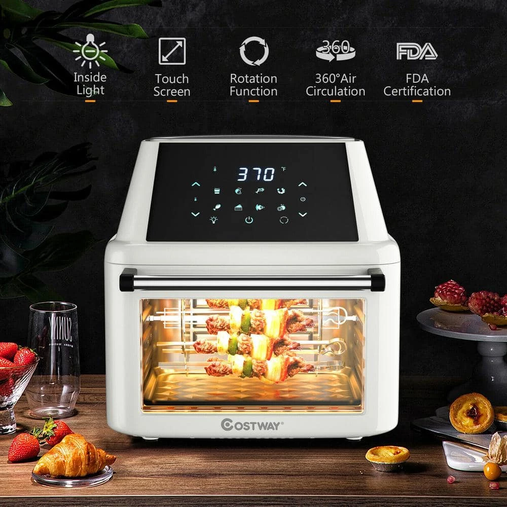 This 8 in 1 air fryer oven is designed with the hot air circulation system for a healthier way of cooking, allowing you to enjoy the delicious food without the extra fat or calories.8 built-in presets make cooking easier or you can set the time and temperature manually. The transparent glass window and inside light make it easy to see the cooking progress of your food at any time. The large capacity of 19 quarts allows you to cook a variety of foods at the same time to meet the needs of the entire family. With rotating function it is perfect for cooking a turkey. The interior of the oven is made of metal to avoid the unpleasant smell of plastic, and it has been multi-certified so it is very safe to use.