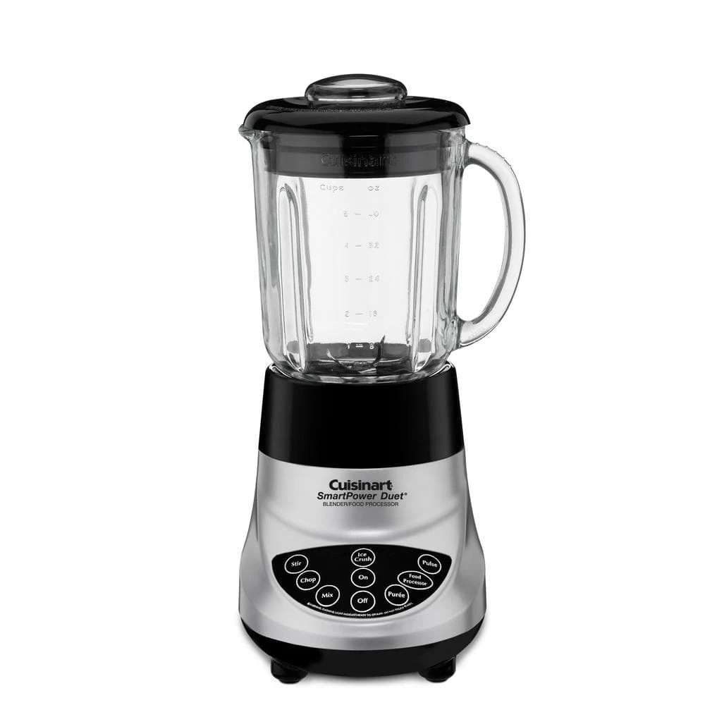 Cuisinart SmartPower Duet Blender/Food Processor in Brushed Chrome has a powerful 500-watt motor with large 40 oz. glass blender jar and clear 2 oz. measured pour lid. It features 7-speed touchpad controls with LED indicators that display off, on, pulse, stir, chop, mix, puree, food processor and ice crush. The 3-cup food processor has an attachment with feed tube and pusher, slicing/shredding disc and chopping blade. All removable parts are dishwasher safe.