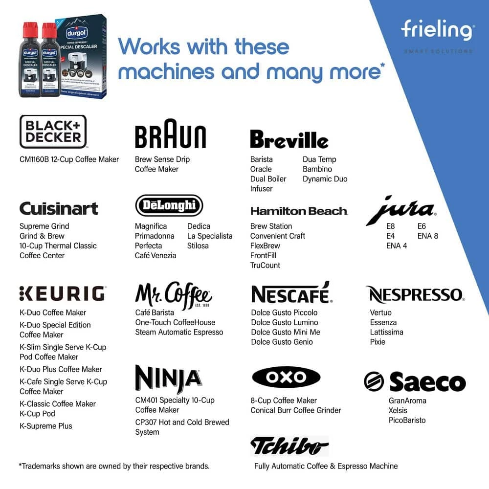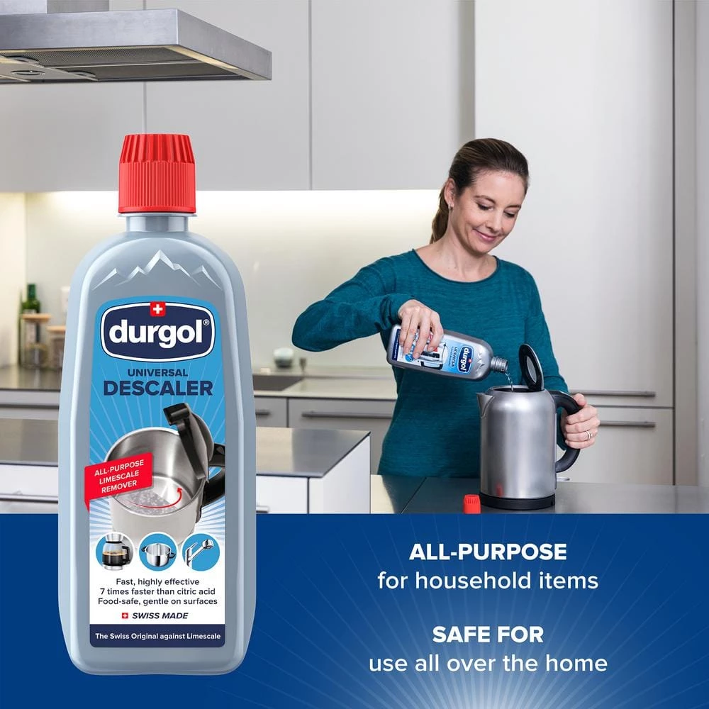 Dont make your coffee/espresso machine huff and puff. If you dont descale regularly, or use an inefficient descaler, it takes longer to brew (reduced heat transfer) and the coffee doesnt taste as good. Ultimately, the machine suffers the inevitable heart attack or, if recognized in time, at the very least will need to be returned for an expensive service. It doesnt have to be that way. Thanks to regular descaling with Durgol, you keep your machine healthy and you enjoy your superb quality coffee or espresso for a long time. Also great for electric kettles. Cleans limescale from faucets and shower heads too.