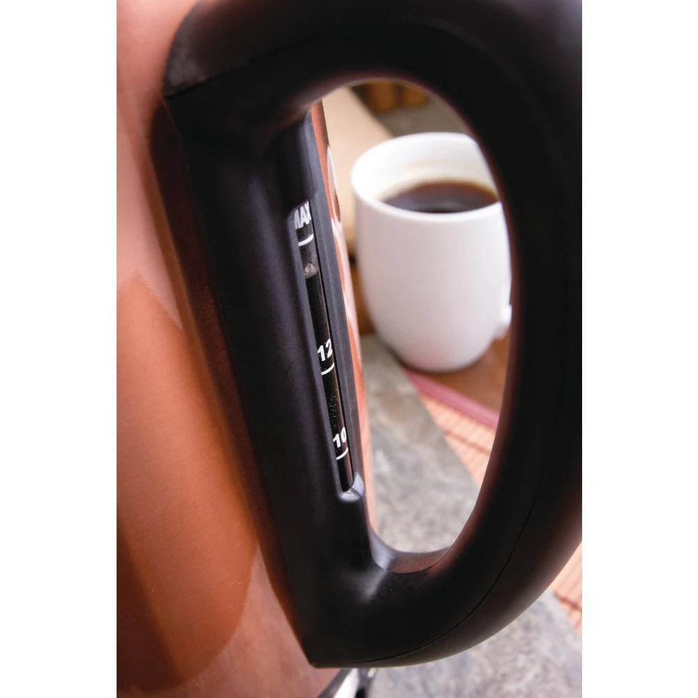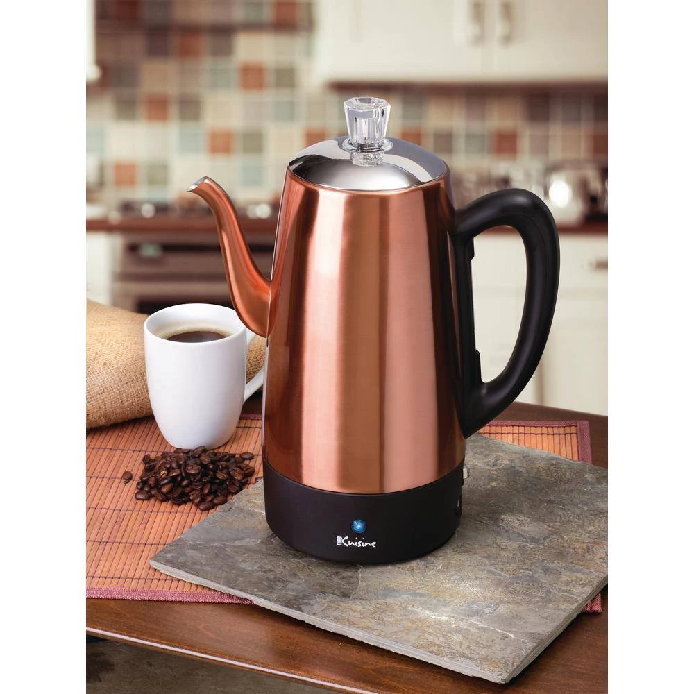 Wake up every morning to the rich, fresh aroma of perfectly brewed coffee with Euro Cuisine beautiful copper finish coffee percolator. This traditional style percolator quickly makes 4-12 cups of your favorite coffee in minutes. Just fill the percolator with water using the water fill level indicator, add your favorite coffee, and turn on the power switch. A built-in LED indicator light illuminates when your coffee is ready to enjoy. The percolator requires no coffee filters to buy or replace. Durable stainless steel construction is easy to clean while the stylish design makes it a welcome addition to any kitchen or office.