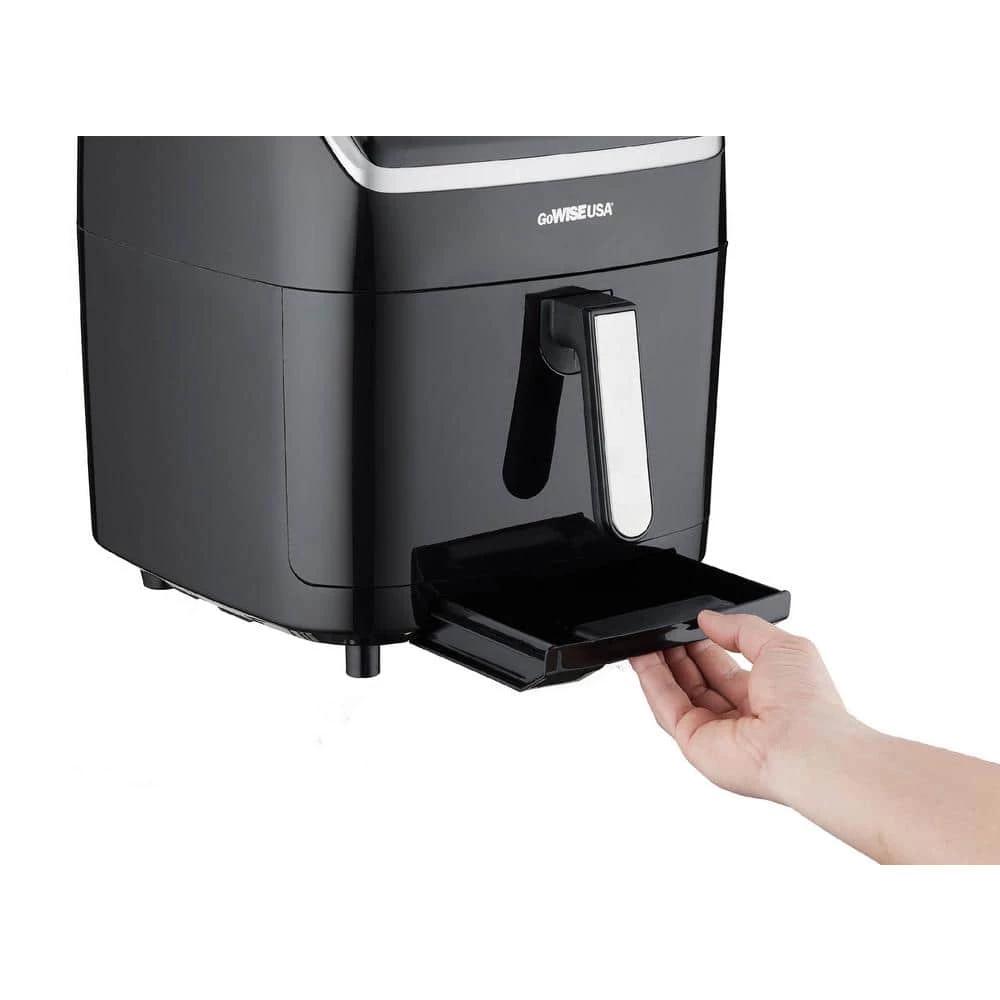 - Pan with crisper tray with legs: air fryer comes with a single fry pan and crisper tray get best broil results with fryer by elevating crisper tray with collapsible legs