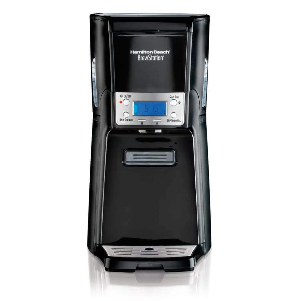 No matter how much you try, its impossible to get freshly brewed flavor from coffee thats been sitting on a hot plate too long. Thats why we created the Hamilton Beach BrewStation, the only coffeemaker that keeps coffee tasting fresh for up to four hours. This best-selling coffee maker works just like a traditional, automatic drip brewer, but with a notable difference: it brews into an internal tank instead of a carafe. This innovation in brewing technology is what will make your last cup taste just as fresh as the first. An internal heater keeps coffee at the perfect temperature for up to four hours, so you can refuel with a fresh, hot cup throughout your morning. And with no glass carafe, you have nothing fragile to break and replace. Instead, you can easily pour a cup with the one-handed simplicity of a dispensing bar. The BrewStation lets you customize your cup with brewing options like bold, regular, small batches and even iced coffee. The internal tank and brew basket both remove for easy fill-up and cleaning.
