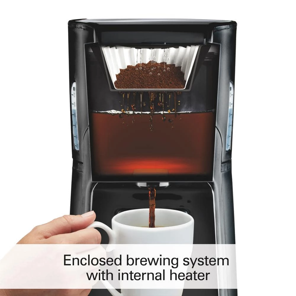 - Enclosed brewing system with internal heater keeps coffee hot and fresh for up to 4 hours