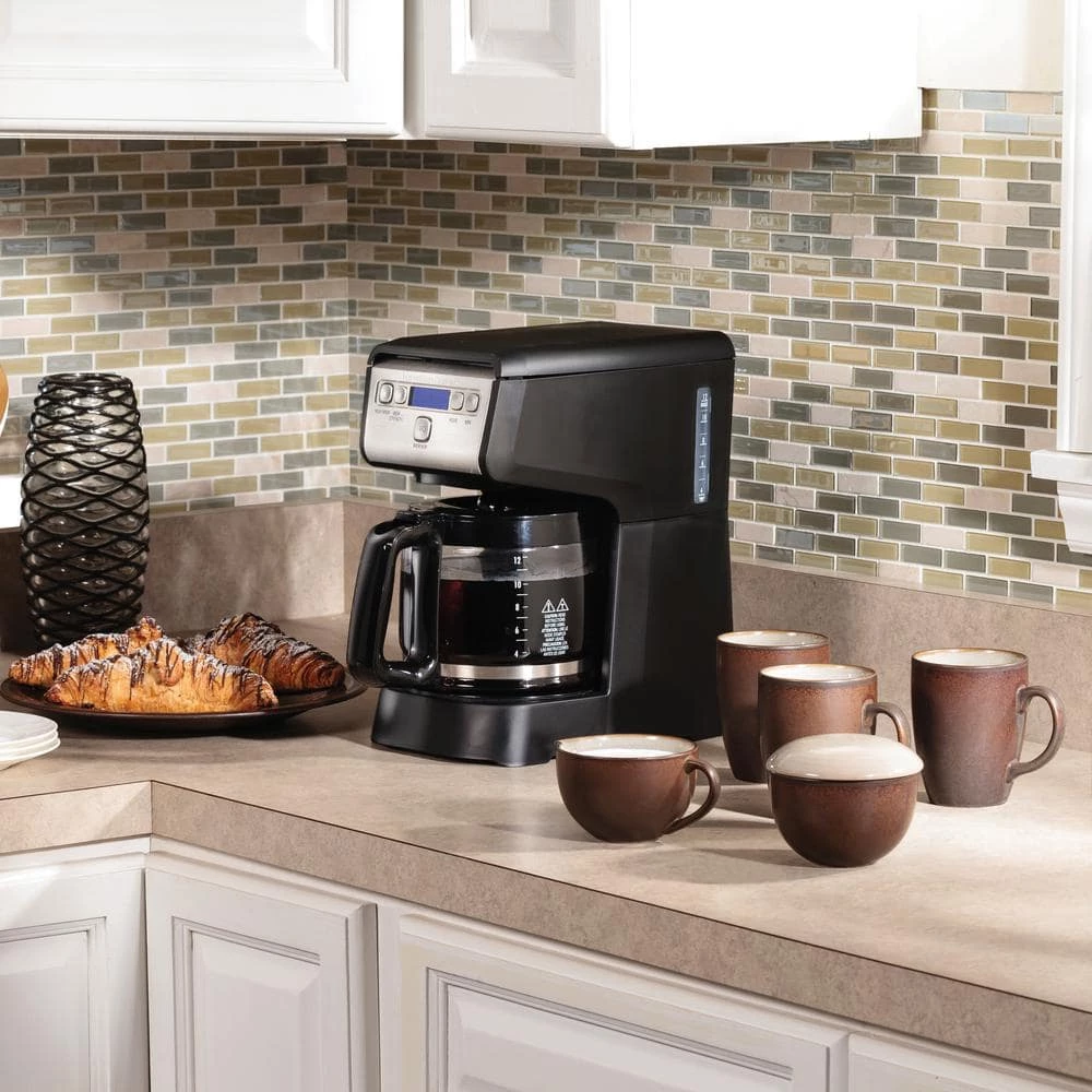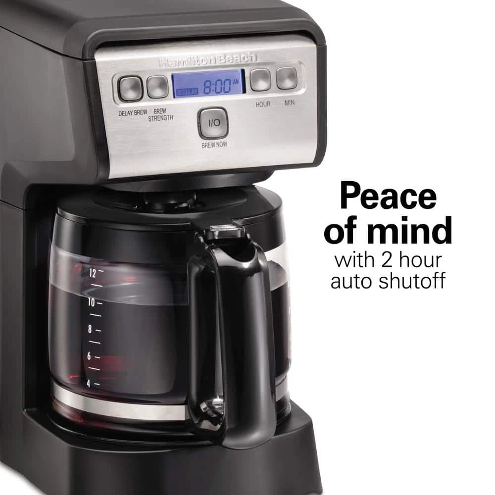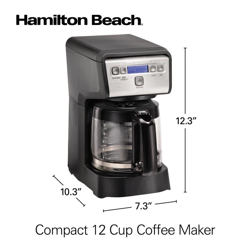 The Hamilton Beach 12-Cup Compact Programmable Coffee Maker is a large-capacity coffee maker nestled in a small compact design packed with features. It’s perfect for small kitchens or any place where you’d like to conserve space. It easily fits under kitchen cabinets with room to spare and features top-mounted controls that are easier to see and use. Programming is simple, too. Easy-Touch programming lets you set the coffee maker up to 24-hours ahead for fresh, hot coffee when you wake in the morning. Customize the strength of your coffee to suit your tastes with the Select-a-Brew brew-strength selector. Auto pause and pour stops the flow of coffee when you lift the carafe away from the coffee maker to pour a cup of coffee before the brewing stops without making a mess. The coffee maker automatically turns off after 2-hours for added peace of mind. The 12-cup glass carafe holds plenty of coffee for serving a large family or group. It’s designed for mess-free, easy pouring. And the transparent water-level window has clear level markings so you can easily see how much water you’ve added. The sleek black and stainless steel design complements any decor.