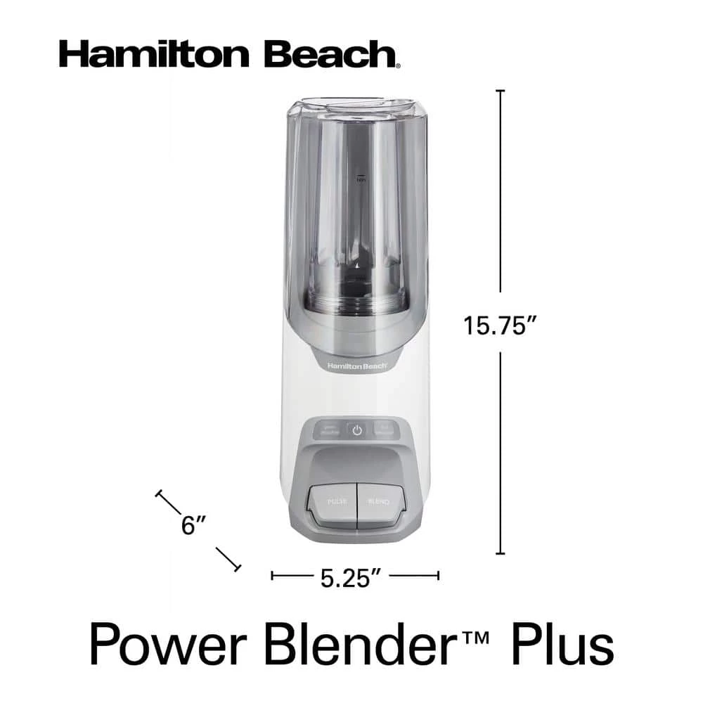 Experience high-performance blending in a compact design with the Hamilton Beach Power Blender Plus. The 800 watt peak-power motor, stainless steel blades and 20 oz. jar with SureBlend technology handles even the toughest frozen ingredients with smooth results. The timed Smoothie setting is optimized for mixing frozen fruit and ice, while the Green Smoothie function ensures leafy greens are blended to a smooth, drinkable consistency.