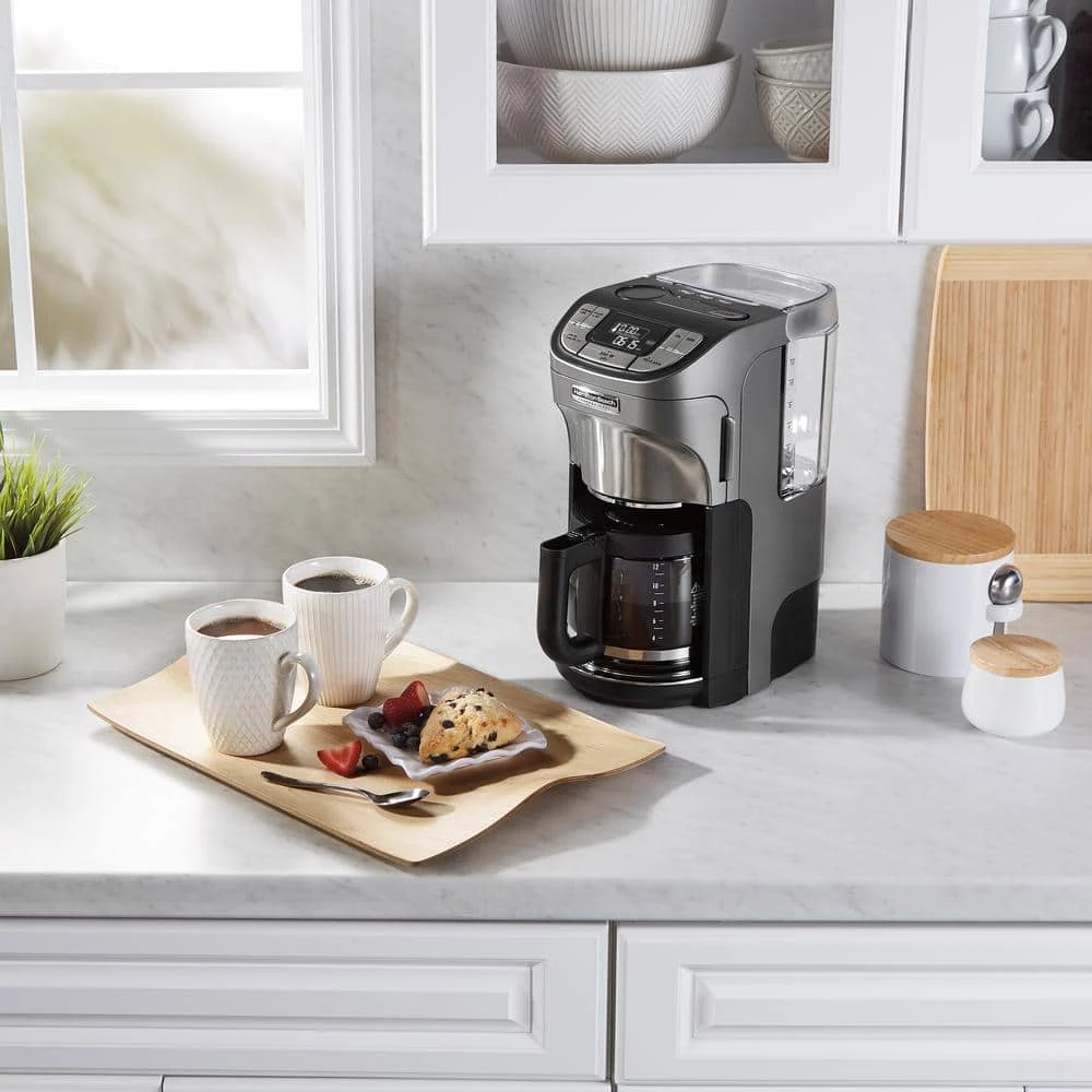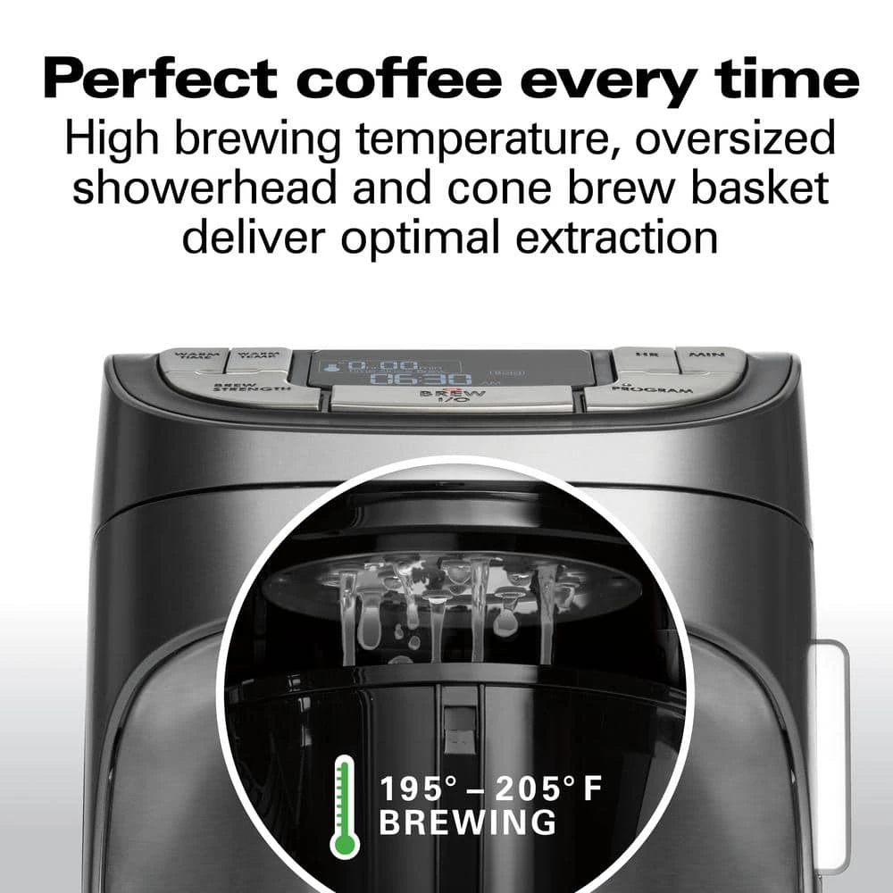Enjoy perfect coffee every time with the HAMILTON BEACH PROFESSIONAL Coffee Maker. It has high-performance brewing to fully extract coffee’s rich, balanced flavor. The high brewing temperature, oversized showerhead and cone brew basket evenly saturate coffee and provide optimal extraction. The removable 60 oz. water reservoir and swing-open cone brew basket make filling easy. You can wake up to hot coffee with the 24-hour advance brew start, which lets you program a fully automatic morning cup. The drip-free carafe with ergonomic handle provides comfortable, mess-free pouring. You can customize your coffee with 4 brew strength options and the adjustable keep warm temperature. The “time since brew” freshness indicator and cleaning cycle reminder help you consistently achieve fresh-tasting coffee, and the auto shutoff time is adjustable. The sleek, brushed-metal design of this coffee maker looks great in every kitchen. Accessories include a coffee scoop, water filter and starter kit of #4 cone filters. Comes with a 5-year limited warranty.