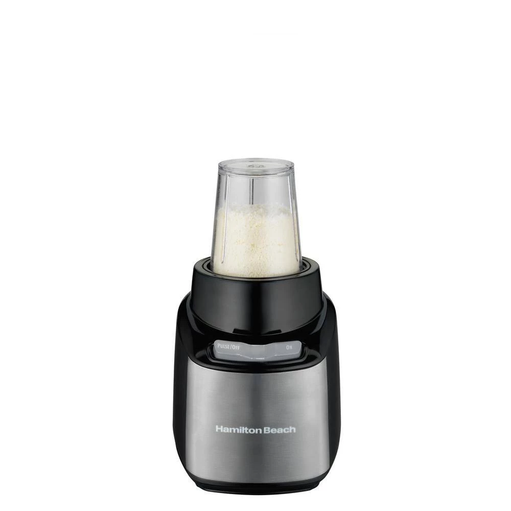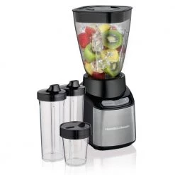Combining the practicality of a full-size blender with the convenience of a single-serve, the Hamilton Beach Stay or Go Blender fits your busy lifestyle. It can easily make smoothies or shakes and can also puree sauces or grind hard cheeses. With four containers included, this blender is the perfect size for every job. The 32 oz. jar is large enough to serve the family and two 16 oz. travel cups with drinking lids are just the right size for smoothies on the go. Additionally, the 8 oz. cup can be used for chopping or finely grinding and with the included shaker lid you can bring it to the table for serving. All of the included containers are made of shatterproof Tritan that is crystal clear, lightweight, dishwasher safe, and BPA-free. Add ingredients while blending using the removable filler cap on the 32 oz. jar and use the pulse button for greater control. Once this multi-tasking blender is in your kitchen, it will quickly become your go-to appliance for preparing many different things.
