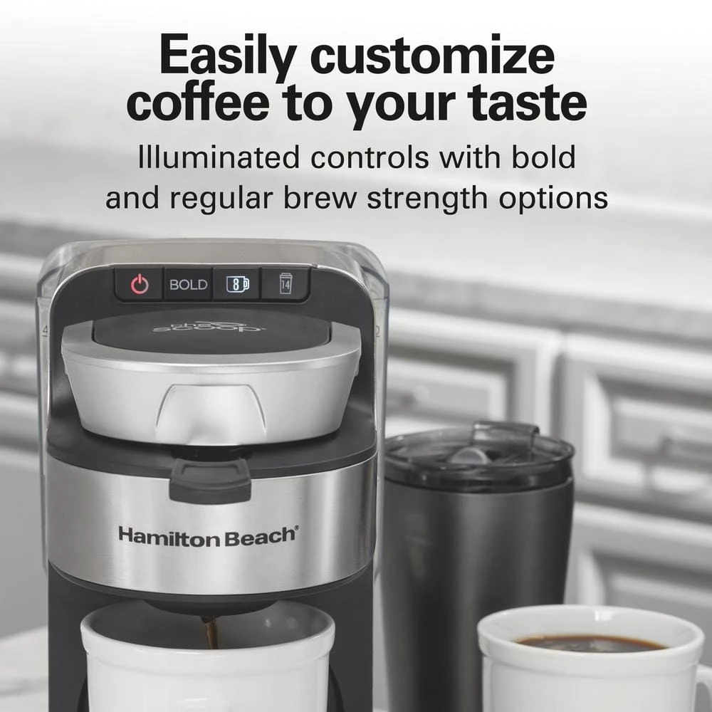 Simplify your morning routine with The Scoop Single-Serve Coffee Maker with Removable Reservoir by Hamilton Beach. Just scoop your favorite ground coffee, place and brew. The mesh brew basket doubles as a scoop, so there’s no need to measure or pour coffee grounds. For fewer refills and to save even more time, the removable 40 oz. water reservoir lets you brew multiple cups back-to-back. The Scoop Single-Serve Coffee Maker with Removable Reservoir doesn’t use single-serve pods or paper filters and you’ll get your first cup in minutes. The convenient flip up/down stand adjusts in a snap to let you brew a standard 8 oz. cup or up to 14 oz. into a 7 in. travel mug. For your peace of mind, this coffee maker automatically shuts off, so you can brew and walk away without worry. The illuminated controls are placed right on top, so you’ll instantly know what’s selected and when coffee is brewing. Includes bold and regular brewing strength options.