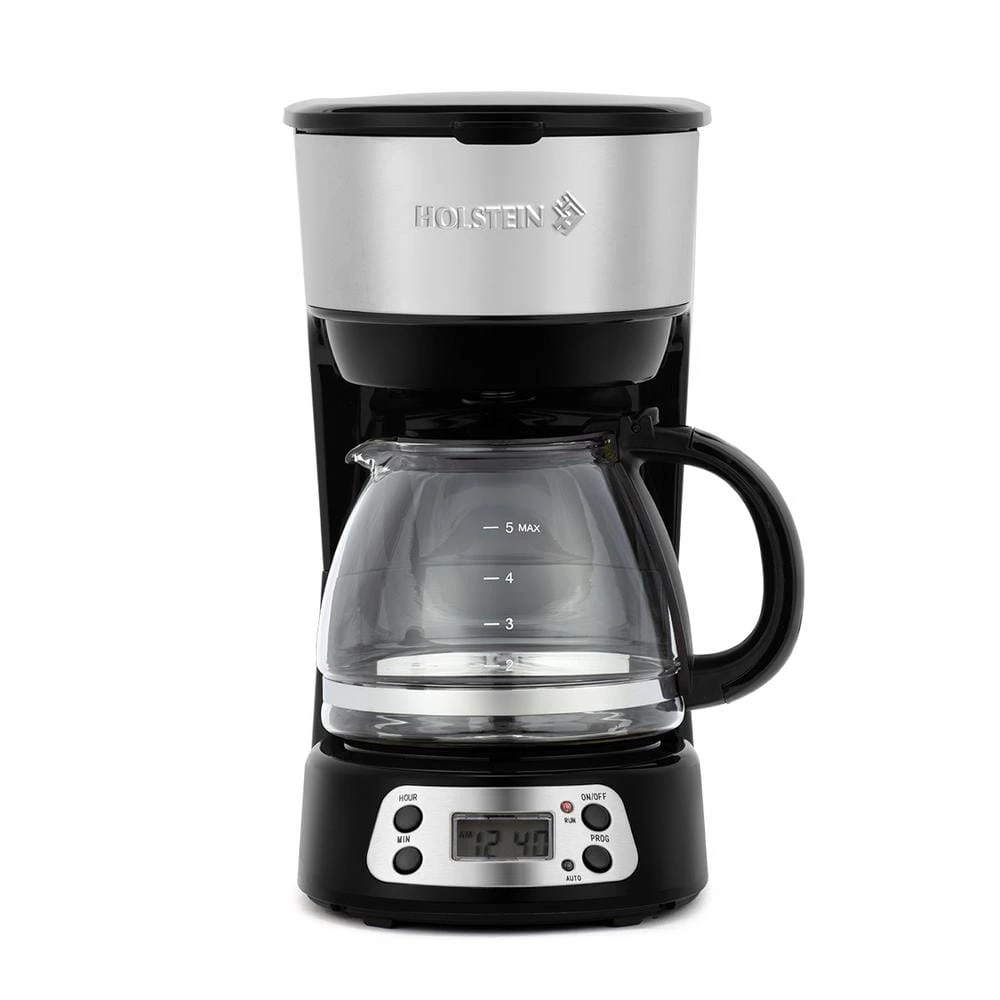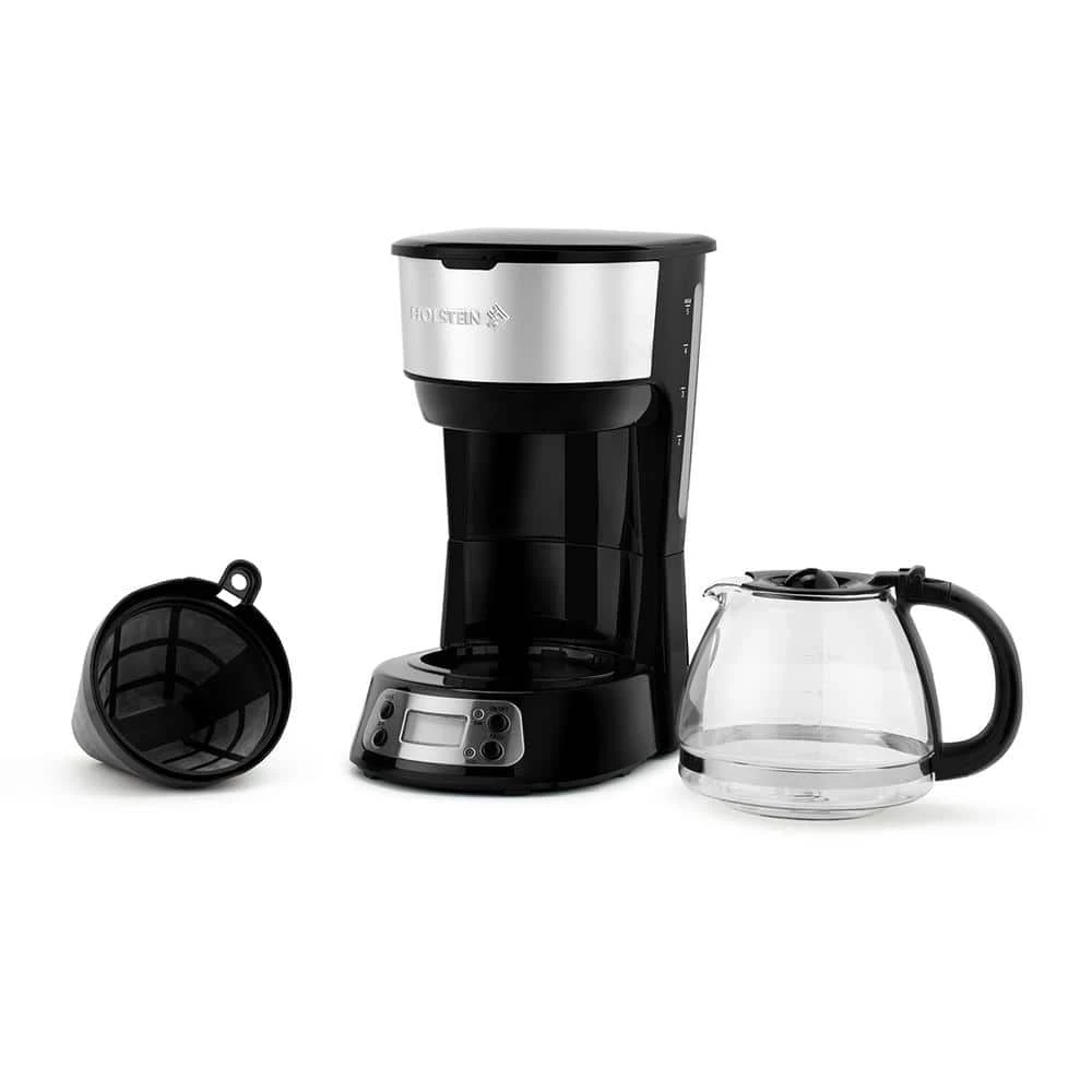 Start your morning with a freshly brewed and rich-tasting cup of coffee with Holstein Housewares 5-Cup Programmable Coffee Maker. This is a staple for any kitchen with the programmable automatic start function you can plan in advance and have your coffee waiting for you. For on-the-go moments, the auto pause and serve function lets you stop and serve a cup of coffee before the brewing cycle finishes. The removable filter basket and measuring spoon included simplify your morning pick-me-up routine and allow you to save money on paper filters. Its space-saving compact design takes less footprint on your countertop and the black color with stainless steel detail will match any kitchen decor. Enjoy your favorite blend with Holstein Housewares 5-Cup Programmable Coffee Maker!