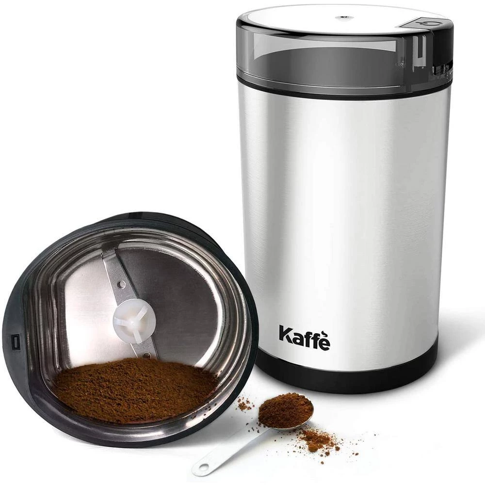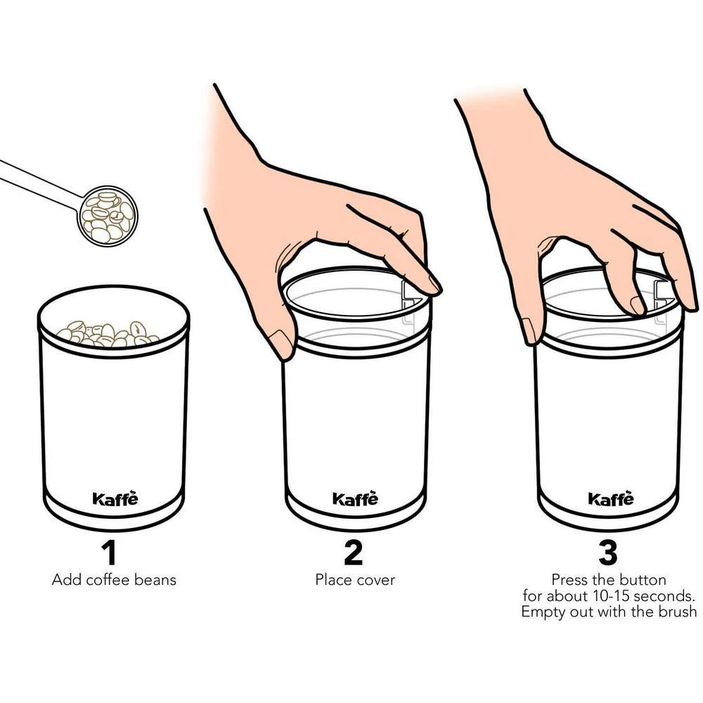 The KF2020 electric coffee grinder by Kaffe gives you a quick and efficient way to grind coffee beans down for use with a French press coffee maker or coffee dripper. Grinding coffee beans immediately before use releases the fragrant essential oils at the right moment to ensure maximum freshness, rich aroma for a full-bodied flavor and complex, satisfying coffee with the most delicious taste in the comfort of your own home. Capacity of up to 2.5 oz (70g) at a time delivers the correct amount of coffee grounds to use for with home or travel coffee dripper systems (Recommended with the Kaffe KF1010 French press). With its powerful motor and stainless steel blades, this electric grinder delivers coffee grounds to your preferred level of coarseness or fineness at the touch of a button. Thanks to the transparent lid, you can see the grinder at work and monitor your ground consistency. The appliance is easy to clean: Simply wipe parts with a damp, soapy sponge. The dishwasher-safe lid can be washed on the top shelf of your dishwasher. An attractive brushed stainless steel finish adds elegance to your kitchen. The perfect gift for any coffee lover, and a wonderful kitchen buddy for those who love convenience at their fingertips. Safety feature: the grinder only operates once you?ve secured the lid.