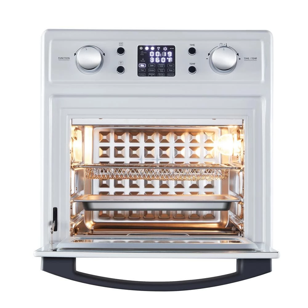 This 16 qt. air fryer toaster oven is smaller than ordinary oven, but is bigger than regular air fryer. Small enough to place it almost where you need it to be, but big enough for your workday breakfast or snack time for home movie time. Your body does not need much oil or fat, and you can get healthy dish the same flavor with less oil in it. It bakes, broils, toasts and fries. The a ventilating metal fan built on top, hot air could more around the whole cavity, which make it the same temperature anywhere and has the food cooked evenly.