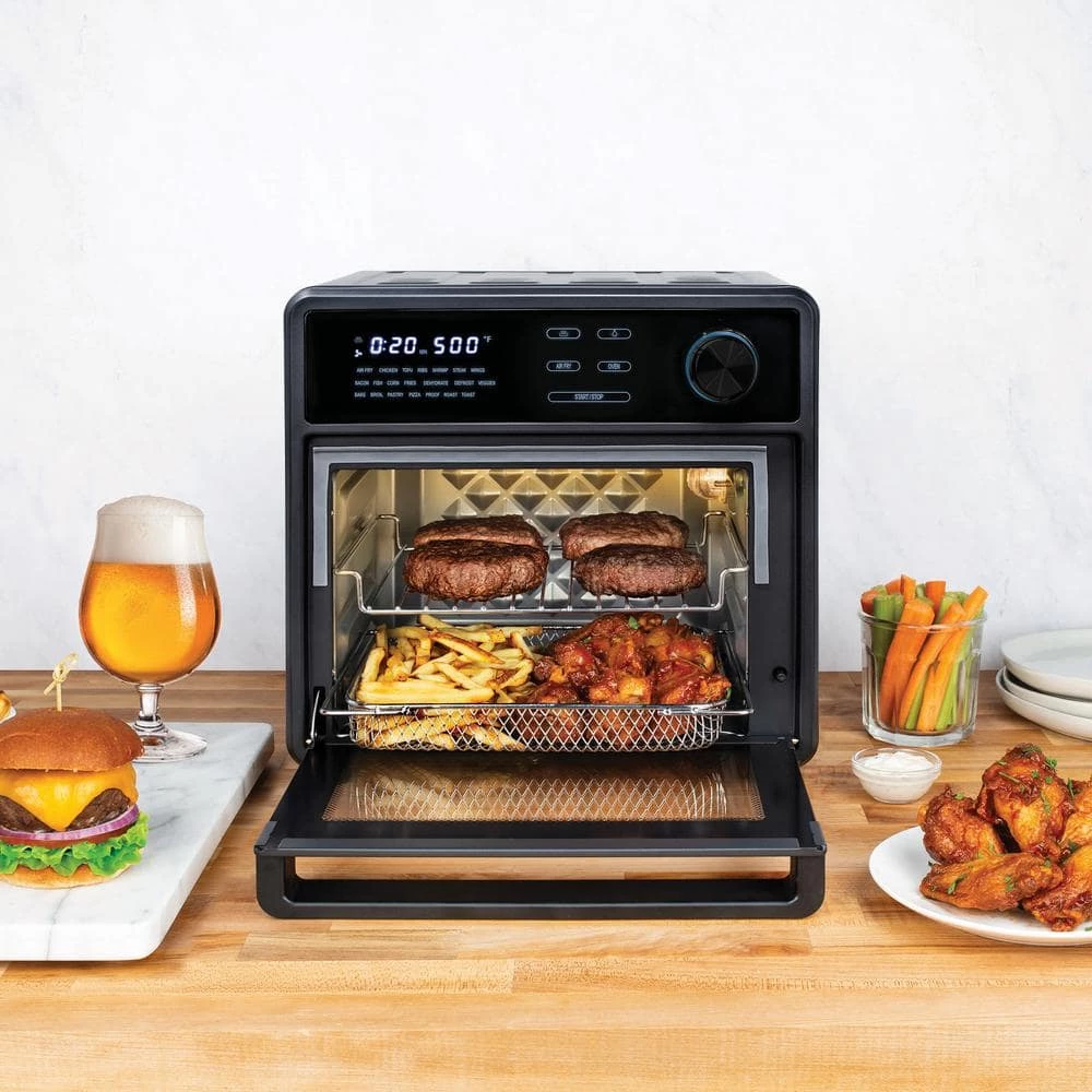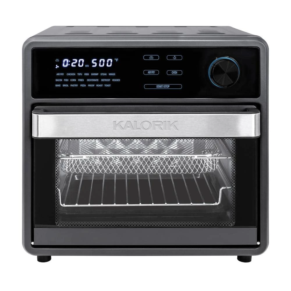 Culinary versatility meets countertop convenience in the form of this digital meal-making powerhouse. Equipped with a streamlined touchscreen interface and Turbo MAXX Technology, the KALORIK MAXX Touch 16 qt. Air Fryer Oven makes gourmet home cooking fast and effortless. 9-in-1 functionality can air fry, bake, toast, roast, grill, braise, sear, broil and dehydrate your favorite foods. Supercharged hot airflow produces a delightfully golden, crispy exterior and moist, tender interior, with little to no oil needed. Simply adjust time and temperature with the intuitive touchscreen control panel for a customized culinary experience. Enjoy foolproof results, as 21 smart presets offer a wide variety of menu options for some of the most common dishes. Sear up to 500°F to create perfect caramelization on your meat, veggies and more. Make crisp-crust personal pizzas or bake scrumptious pastries with the OVEN function. You can even use the PROOF function to make homemade dough. Create your own beef jerky or dehydrated fruit for the perfect lean, nutritious snack with the DEHYDRATE preset. Meanwhile, a special WARM function keeps your meals at optimal serving temperature. The oven’s generous 16-quart capacity lets you cook family-style portions and is large enough to fit 6 slices of toast or an 8 in. pizza. Five cooking accessories – an air frying basket, air rack, baking tray, crumb tray, and tray handle, plus an included recipe book – give you everything you need to get started.