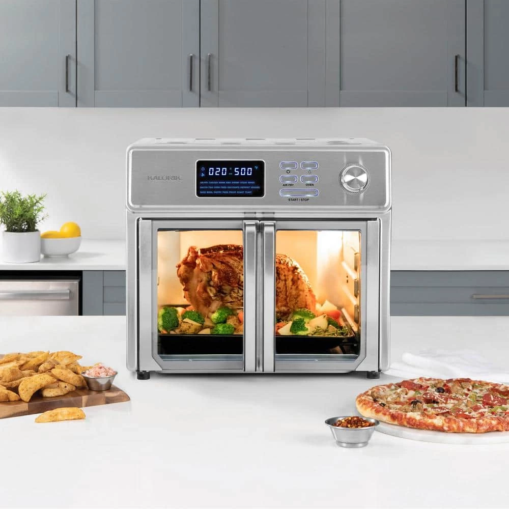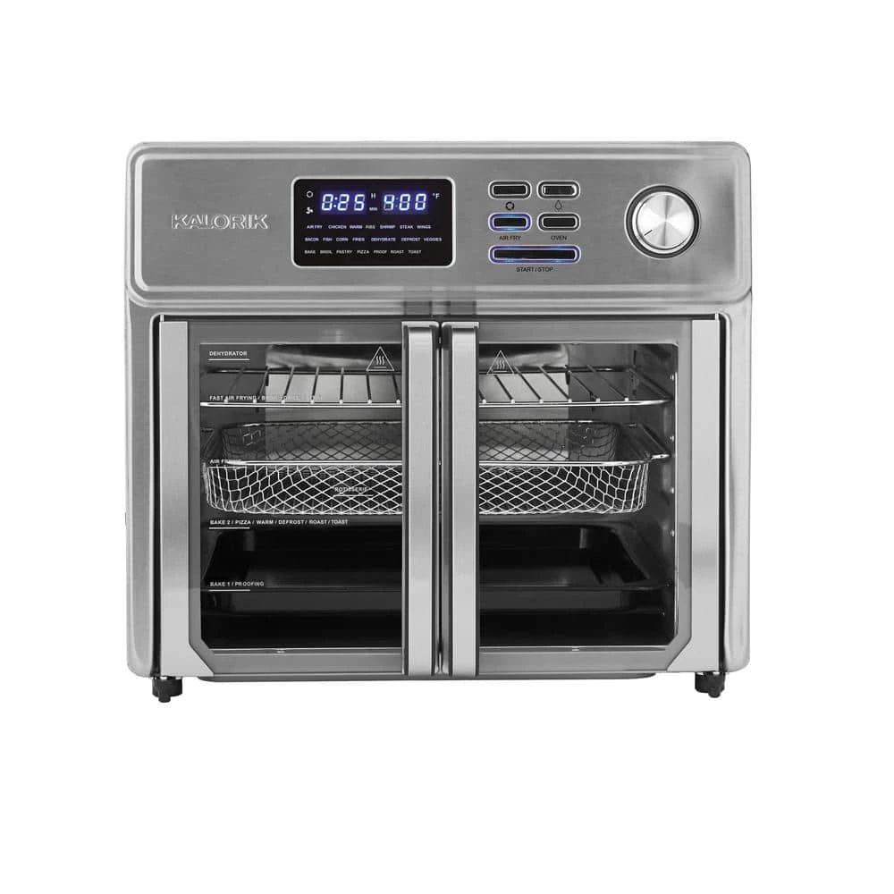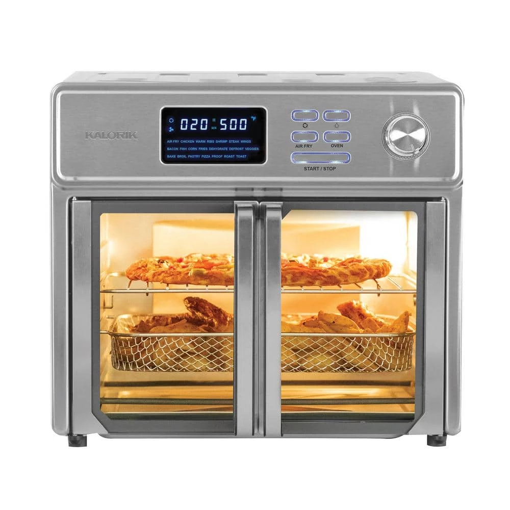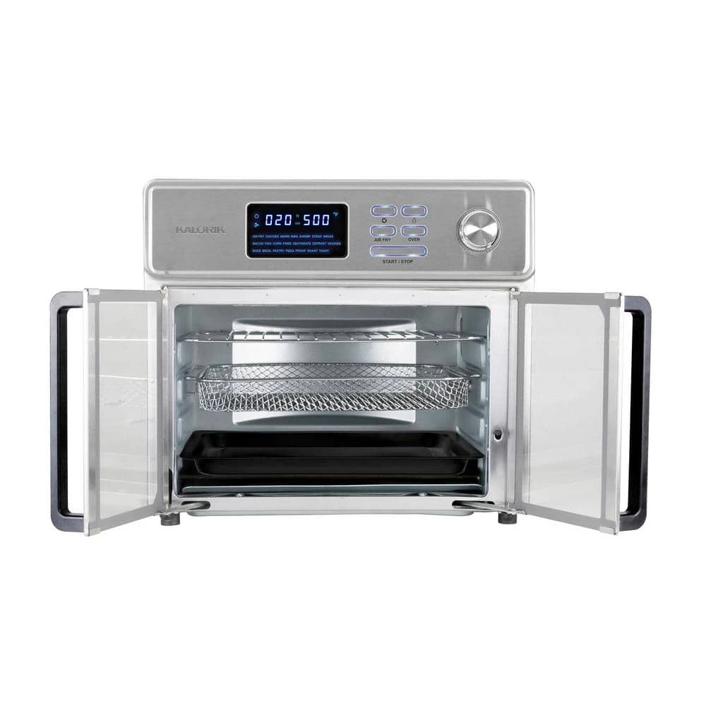 Discover the new generation of air fryer ovens. Kalorik 26 qt. Digital Maxx Air Fryer Oven combines 10-appliances into one. It functions as an air fryer, roaster, broiler, rotisserie, dehydrator, oven, toaster, pizza oven and slow cooker. Kalorik Digital Maxx Air Fryer Oven uses special Turbo Maxx technology to cook food faster than ever. Upper and lower heating elements provide even heat distribution for perfectly-cooked results. Optimized airflow system and high-performance turbo fan are engineered for maximum circulation, delivering the same crispy texture and rich flavor of deep fried food, with little to no oil. This reduces fat and calories for healthier meals. Unique rotisserie setting rotates the included spit accessory during cooking, allowing meat to roast evenly in its own juices and develop maximum flavor. Kalorik Digital Maxx Air Fryer Oven reaches up to 500°F, perfect for searing meat or vegetables to caramelized perfection. Oven can fit a large chicken, 12 in. pizza or up to 9-slices of toast in its cavity. Modern and multi-functional, Kalorik Digital Maxx Air Fryer Oven features glass French doors with single-hand opening to prevent dripping or scalding. Built-in auto-shutoff safety feature automatically stops operation when doors are open. Easy to use digital LED display contains 21-presets for foolproof cooking. Accessories: air frying basket, baking pan, air rack, crumb tray, bacon tray, steak tray, rotisserie spit, rack handle and rotisserie handle.
