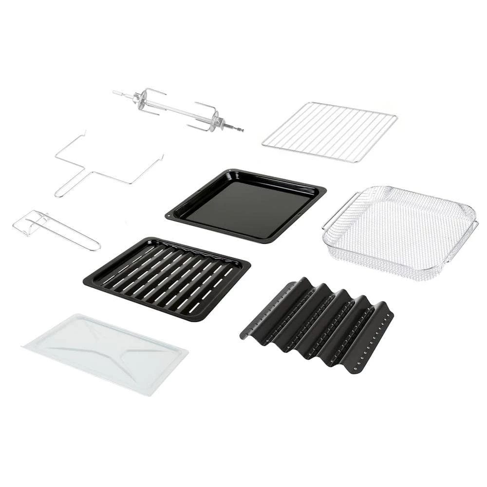 - Accessories include an air frying basket, baking pan, air rack, crumb tray, bacon tray, steak tray, rotisserie spit, rack handle and rotisserie handle