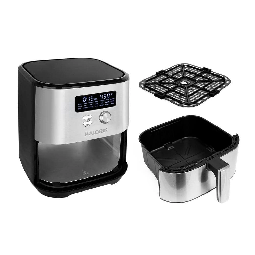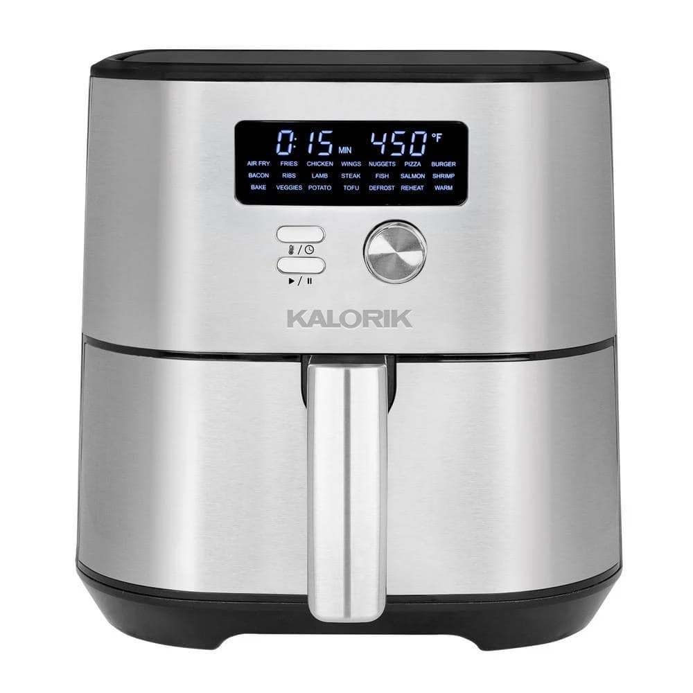 Indulge in the delicious golden crunch of your favorite air-fried foods – the Kalorik MAXX 7 Quart Digital Air Fryer delivers healthy meals in a fraction of the time. Turbo MAXX Technology and 1750 watts of power work to crisp food to perfection in a matter of minutes, as this powerful air fryer reaches up to 450°F to create marvelous caramelization on meats, fish, veggies, and more. The Kalorik MAXX 7 Quart Digital Air Fryer uses the power of superheated air instead of oil to capture the golden crunch and tender, flavor-rich interior of deep fried food without the added fat and calories. An easy-to-use digital control panel offers 21 smart presets for foolproof results each time, ideal for extra-crispy french fries, onion rings, fried chicken, shrimp, mozzarella sticks, steak, bacon, pizza, nuggets, burgers, tofu, veggies, and more. Even reheat yesterday’s dinner to transform soggy leftovers into crispy fresh-tasting meals. Meanwhile, the double nonstick-coated basket with trivet is removable and dishwasher-safe, making for fast, easy cleanup. Sleek stainless-steel housing adds a sophisticated modern flare to your kitchen. A 7-quart capacity yields large, family-sized portions, serving from 4 to 6 people. Get started with a variety of mouthwatering appetizers, entrees, and desserts with the included MAXX recipe book.