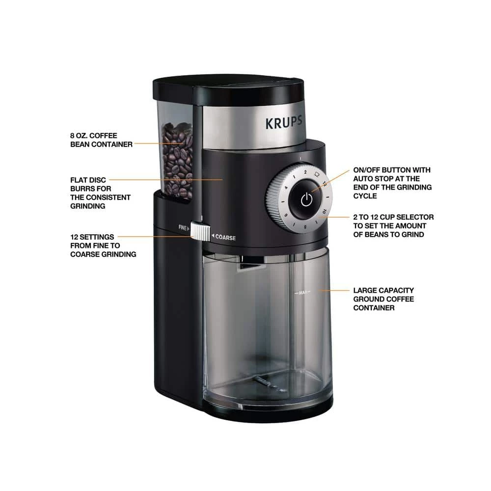 The KRUPS Precise Grinder explores an array of fresh coffee aromas. The precise grinder makes perfect ground coffee for Espresso, French Press, Drip Coffee, Pour Over and more. The KRUPS Precision Grinder lets you fine tune your coffee with its 12-grind sizes range each with micro adjustments to fully extract the flavor of coffee beans for every coffee brewing method. Regardless of the type, roast, or origin of your coffee beans, the KRUPS Precision Grinder’ flat burr grinding disks maximize their flavor profile. Select between 2-12 cups when you are grinding to get an exact quantity you need each time.