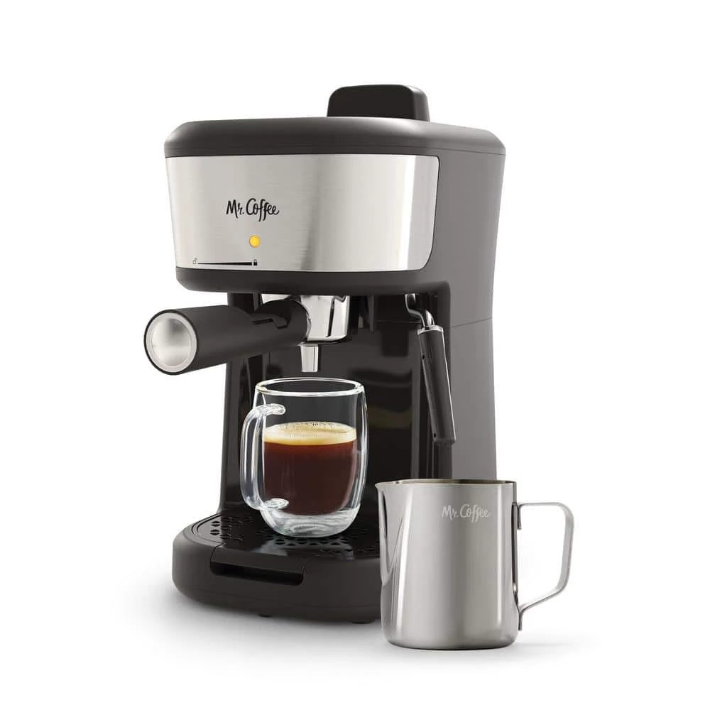 Become your own at-home barista with the Mr. Coffee 4-Shot Steam Espresso, Cappuccino, and Latte Maker. Equipped with a powerful frother, this espresso maker creates rich espressos and lets you whip up lattes and cappuccinos to light, frothy perfection. The powerful steam-brewing process makes dark, rich espresso, and the extra-large portafilter brews up to 4 shots, great for making Cuban coffee. The stainless steel frothing pitcher and integrated frothing wand make it easy to steam and froth milk so you can effortlessly create your favorite cafe-style drinks. The water pitcher includes an easy measuring system to help you use the right amount of water to brew espresso and steam milk to perfection. This espresso maker also includes a convenient measuring scoop for easy coffee scooping and leveling.