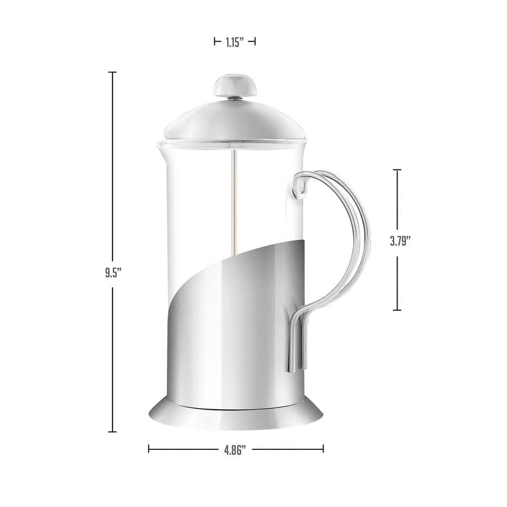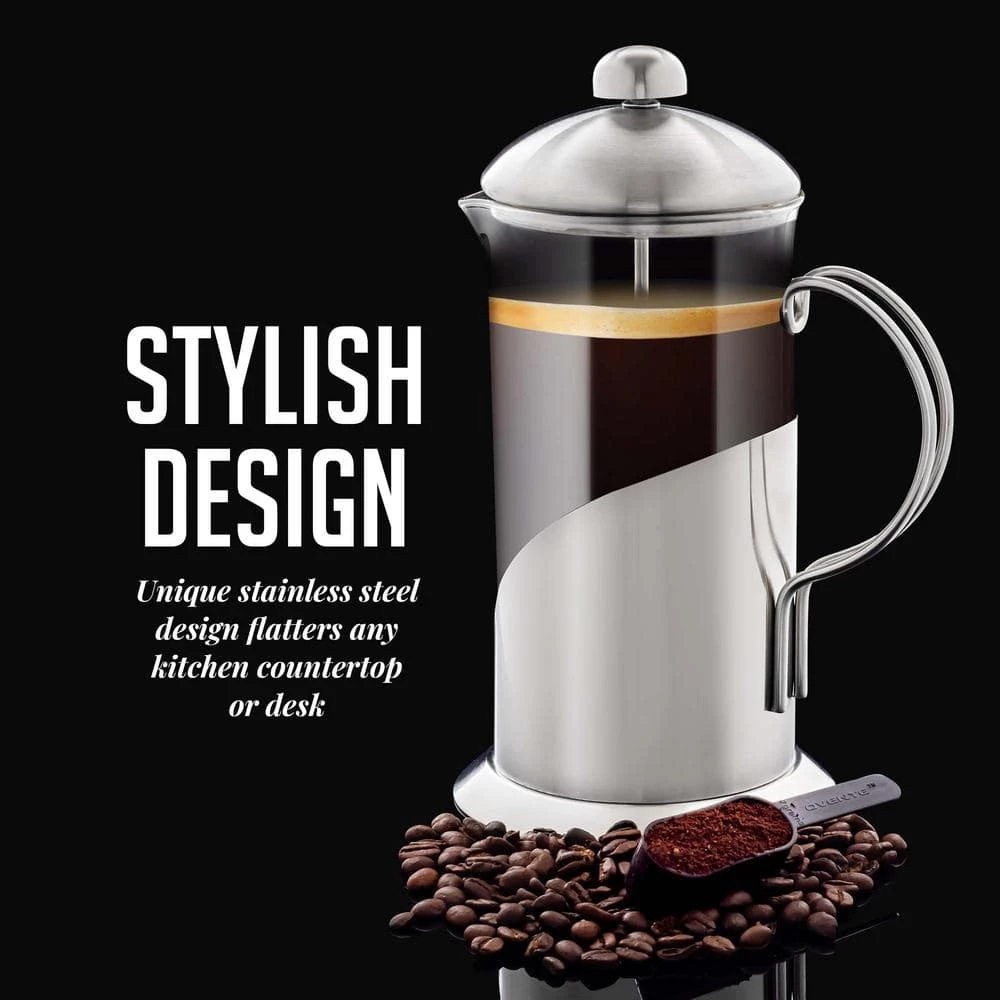 Be your own barista – Make your favorite coffee or tea at home! Just like how the most scrumptious foods contain some oils and fats, the Ovente Stainless Steel French Press works thoroughly to extract all the flavorful oils and bold, complex flavors that naturally occur in gourmet coffee beans. These flavor-enhancing oils are absorbed by the costly paper filters used with traditional coffee pots. The 4-part stainless steel plunging system uses a fine mesh filter to thoroughly extract all the succulent flavors from your coffee grounds, leaving you with a smooth cup of coffee with little to no waste. Beautifully packaged, they make excellent gifts, especially for workaholics, studious college students, and/or coffee and tea lovers! Composed of heavy-duty, heat-resistant borosilicate glass, the durable carafe is equipped with a beautifully designed protective stainless-steel shell, making it perfect for taking it with you to work or on vacation. You’re also not limited to just coffee or tea, this handy tool can be used to make espresso, yerba mate, lemonade, real hot chocolate, apple cider and almond milk too. And its versatility goes beyond just-drinks-you can use it to wash grains, make chicken stock, strain frozen vegetables, create a unique terrarium, and infuse essential oils! Caution: Not for stovetop use.