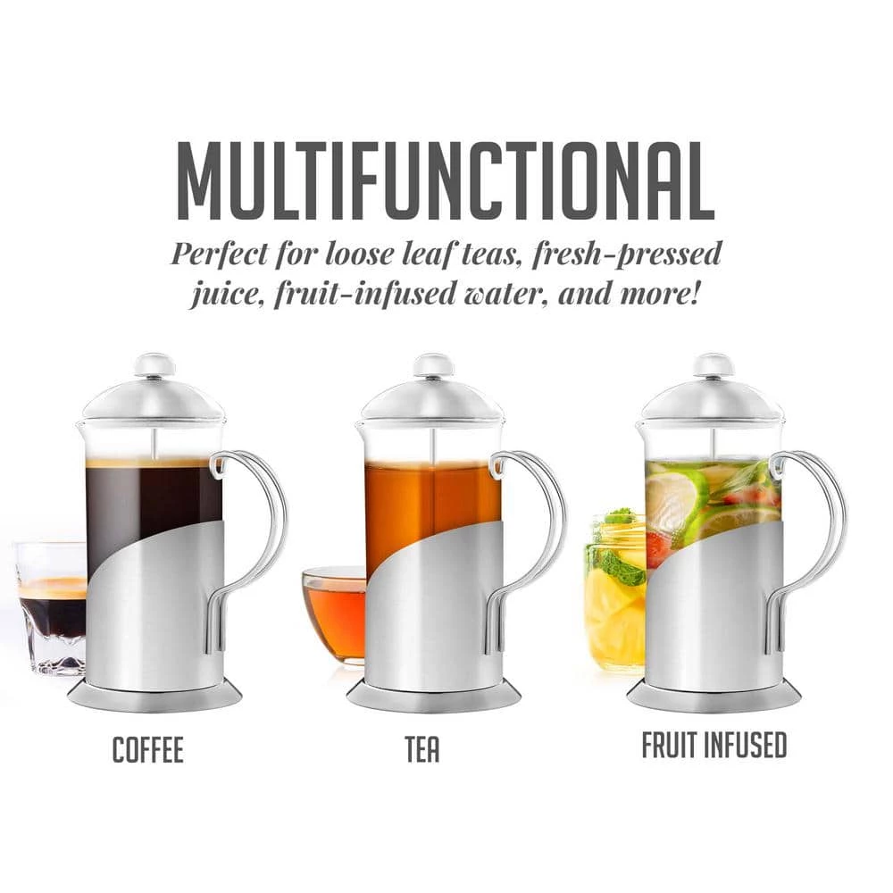 - Versatile Function – This French Press is not limited to just coffee as it is also an effective tool to make decadent loose-leaf teas, fresh-pressed juice, fruit-infused water, sangrias, cocktails or even to wash quinoa and strain veggies.