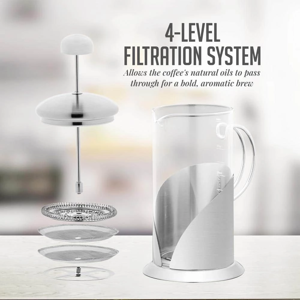 - 4-level Plunging System – Made with 4 high-grade stainless-steel layers which includes a mesh filter and a single-spring whisk that adds a layer of bubbles on top of the coffee.