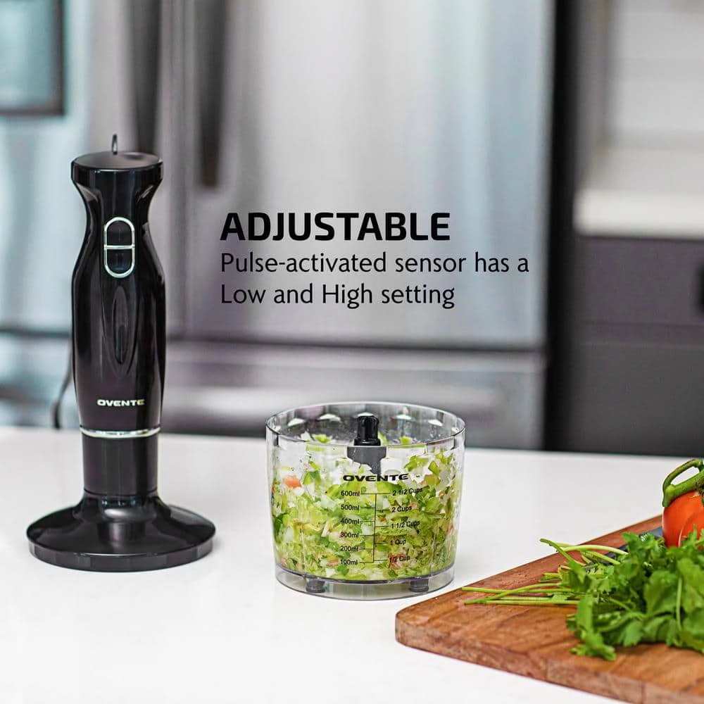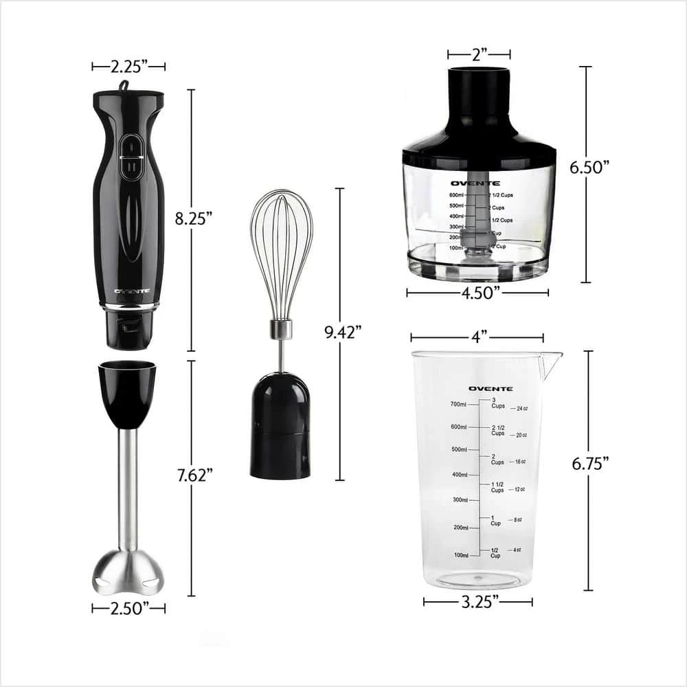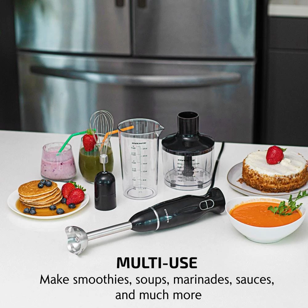 Witness ease, convenience, and versatility at work-right in your own kitchen. Discover a world of innovative cooking possibilities with the Ovente HS565 Multi-Purpose Immersion Blender. It’s a pleasure to blend and mix food with this hand blender because using this appliance is fun and effortless! Its lightweight body along with its ergonomically-designed non-slip handle is comfortable to hold and control, that’s why cooking won’t ever feel like a chore again. Whip up all of your favorite gourmet soups, guacamole, smoothies/shakes, cake batter, salsas, sauces, marinades, salad dressings, or even homemade baby food for your precious bundle of joy with just one press of a button. Powered by a powerful 300-watt motor, it works quickly and effectively – expertly mixing anything you desire into a smooth, evenly-mixed medley of mouth-watering flavors. Its Slim-Stick design enables this hand blender to fit into any mixing bowl, pot, beaker, or cookware without restriction. It’s compact enough to fit anywhere, but powerful enough for the toughest blending jobs. It was also carefully designed to come apart easily so that cleanup and storage are not a problem. The hand blender also comes with 3 premium attachments – 24 oz. beaker that can be used for measuring liquid, a food chopper that can be attached to the motor housing for chopping ingredients, and a stainless steel egg whisk for whisking cream, egg whites, and other treats.