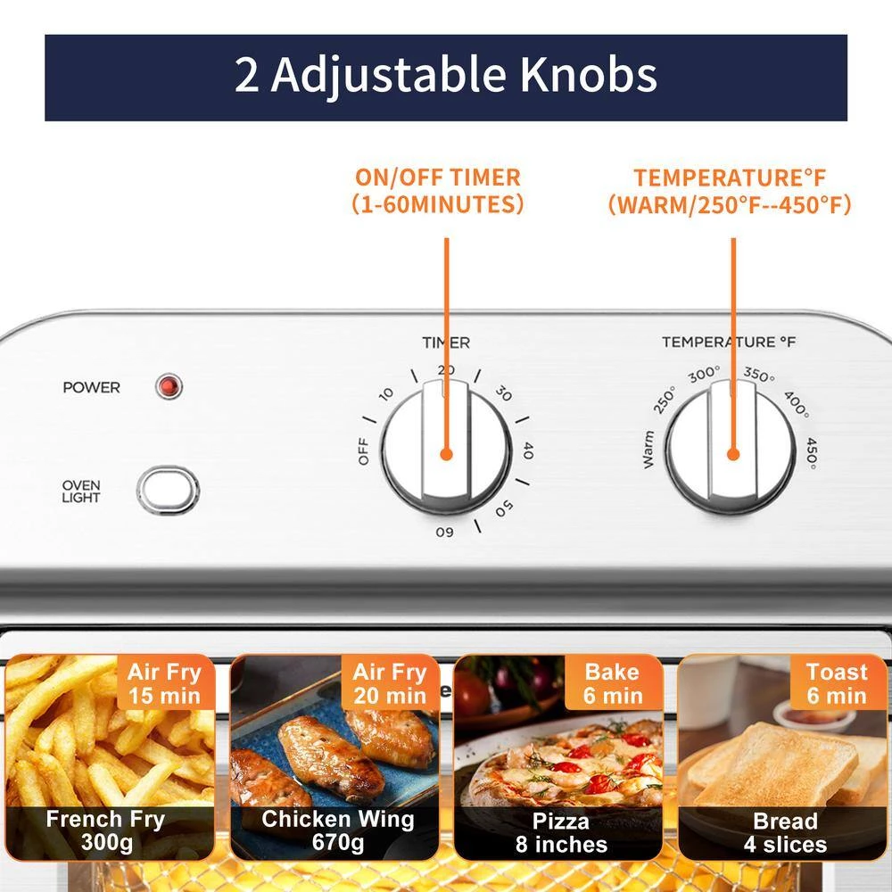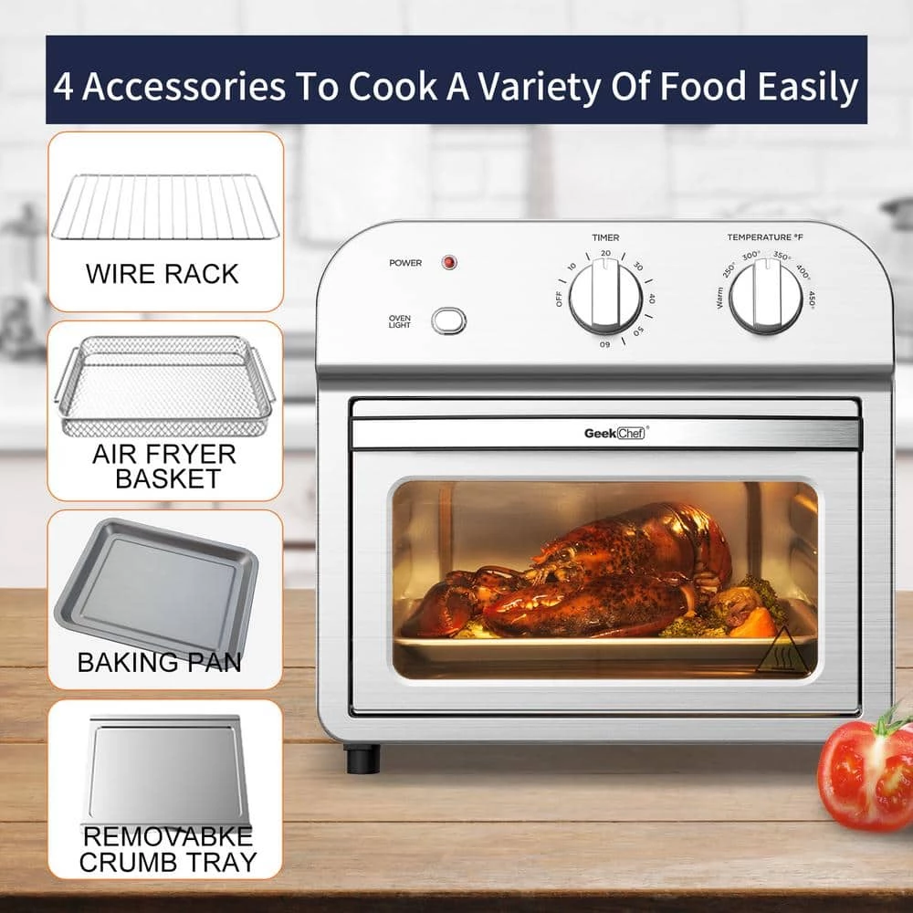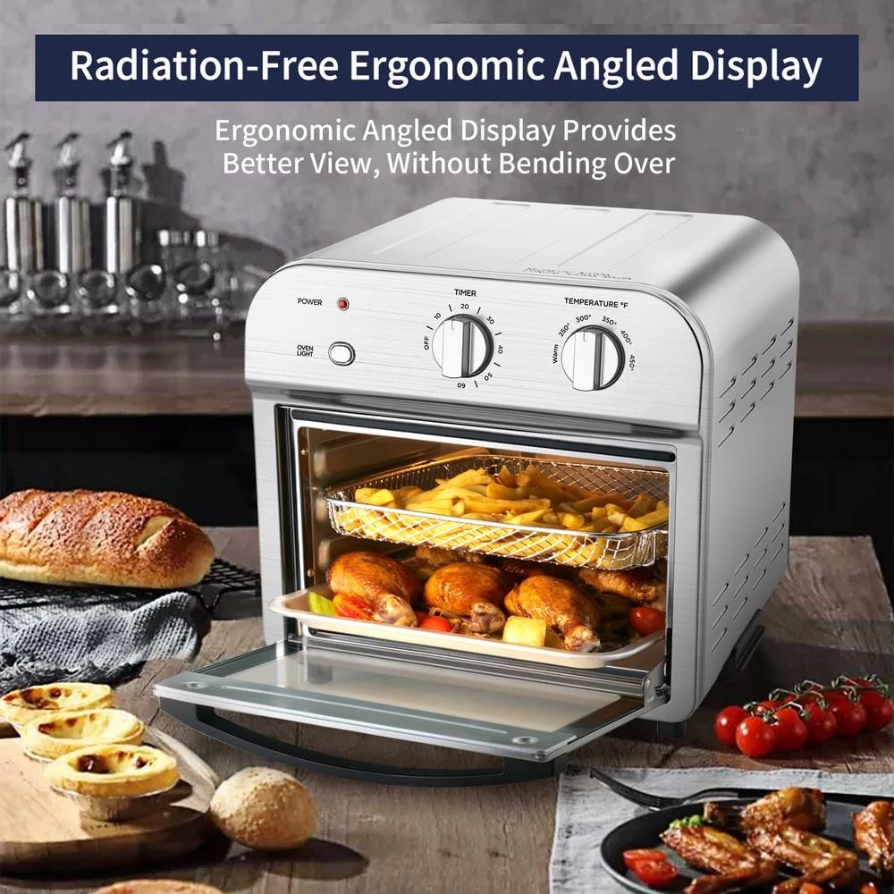 - ETL listed for safety, 1500w strong power makes super efficient to cook food in the healthiest way by cutting over 85% of fats, pull-down door with a large window makes it easy to monitor progress as food cook, brushed stainless steel exterior enhances any kitchen decor; nonstick interior and stainless steel exterior wipe clean in seconds