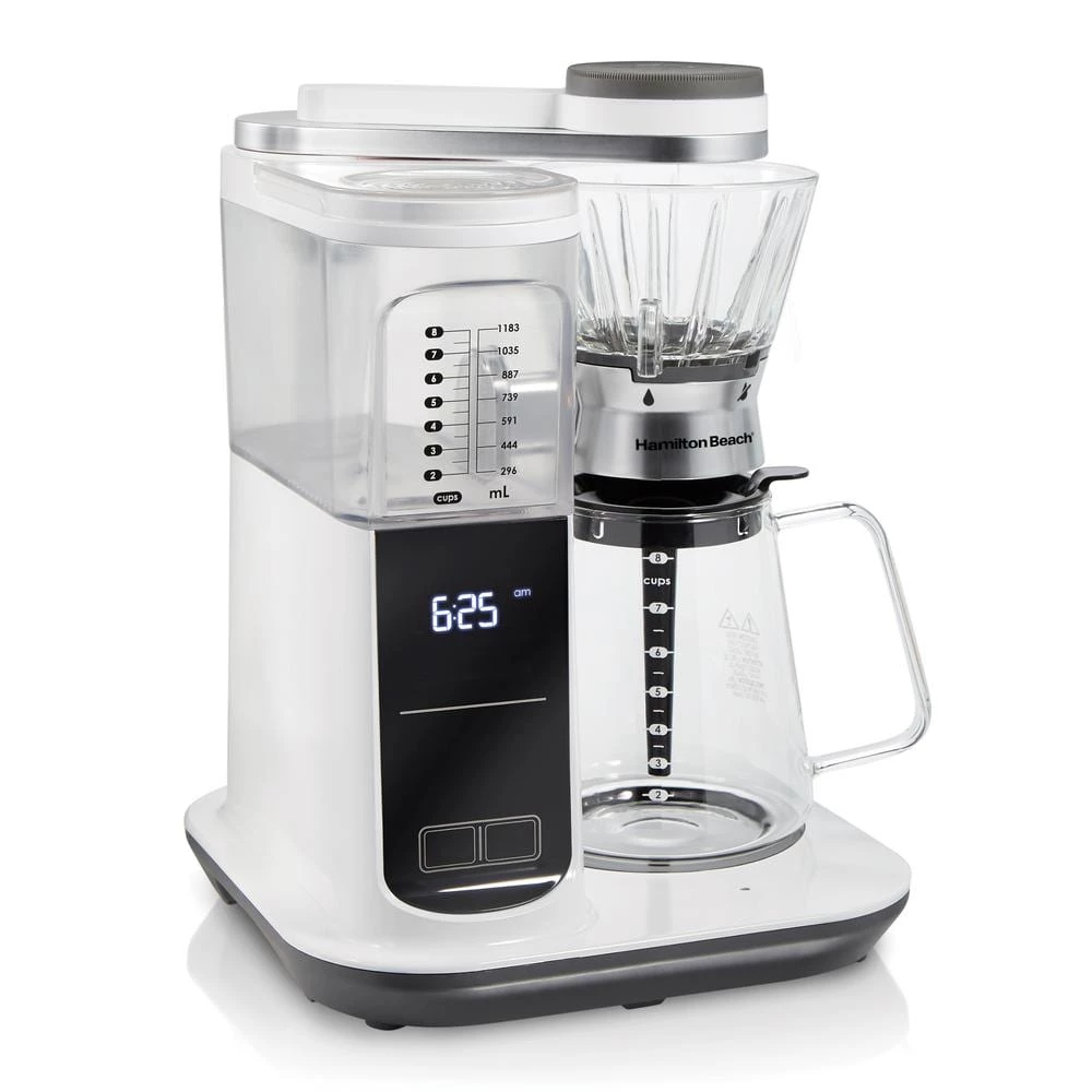 You’ll enjoy custom-crafted, barista-quality pour-over coffee brewed precisely the way you like it when you brew with the Hamilton Beach Convenient Craft Automatic or Manual Pour-Over Coffee Brewer. It gives you 2 ways to brew rich, flavorful pour-over coffee at home. You control the bloom cycle, temperature, and brew strength for rich, delicious pour-over coffee brewed to your exact specifications. Use the machine’s automated process when it’s convenient, or brew manually when you have more time or want more control. The display guides you through each step of the brewing process, giving you the confidence to make perfect pour-over coffee, even if you’re just learning. It shows you how much water and coffee to add based on the brew strength and number of cups you select. The integrated scale counts down as you add coffee grounds, to ensure you’re adding the exact amount of coffee grounds for the precise coffee/water ratio every time. The oversized 12-hole showerhead evenly saturates coffee grounds at the ideal temperature, to extract the balanced, rich flavors of your coffee. Choose from 5-brew strength options and 2-heat settings, hot and extra hot. Incudes 4-cone filter samples and a water filter pack.