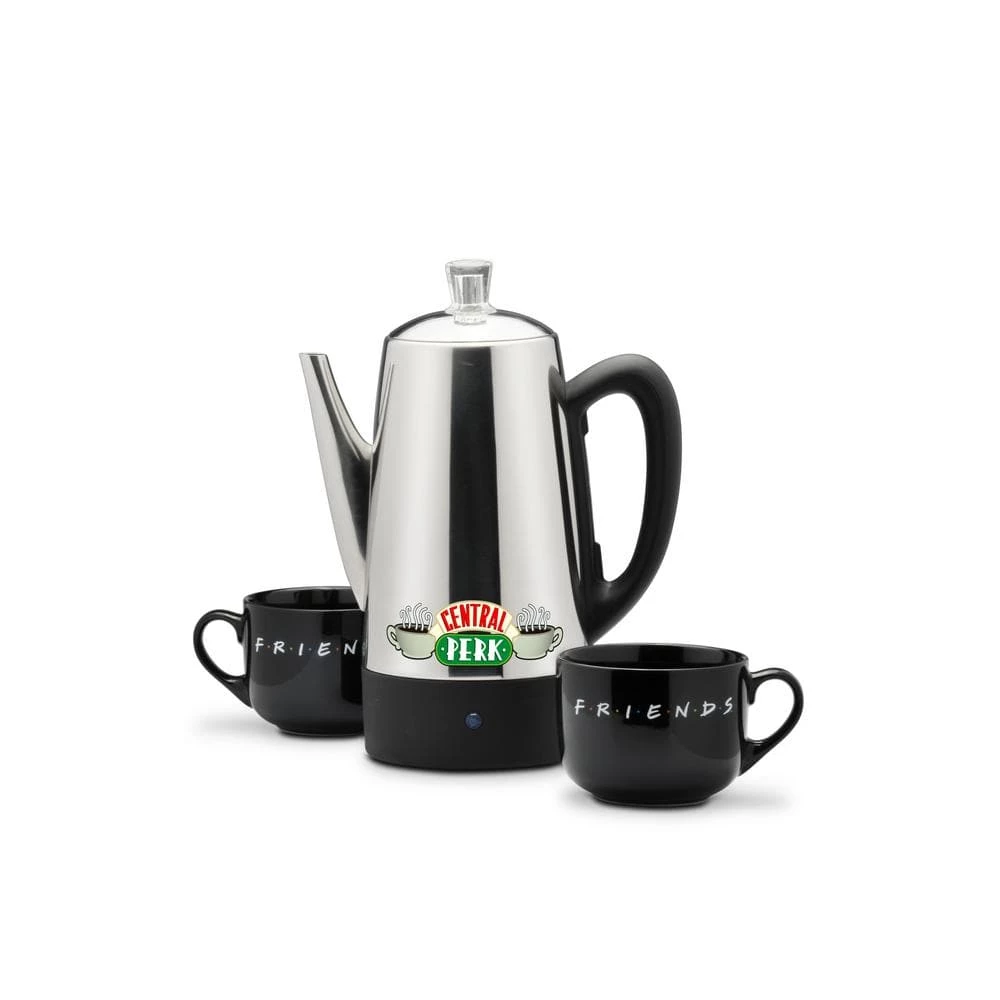 Perk up your mornings with the Friends 12-cup electric percolator. Steam forces the water to continuously cycle through the coffee grounds resulting in a full-bodied brew that will make you as bubbly as Phoebe. Comes with two large 24-ounce ceramic coffee mugs to match. Simple to use and to clean.