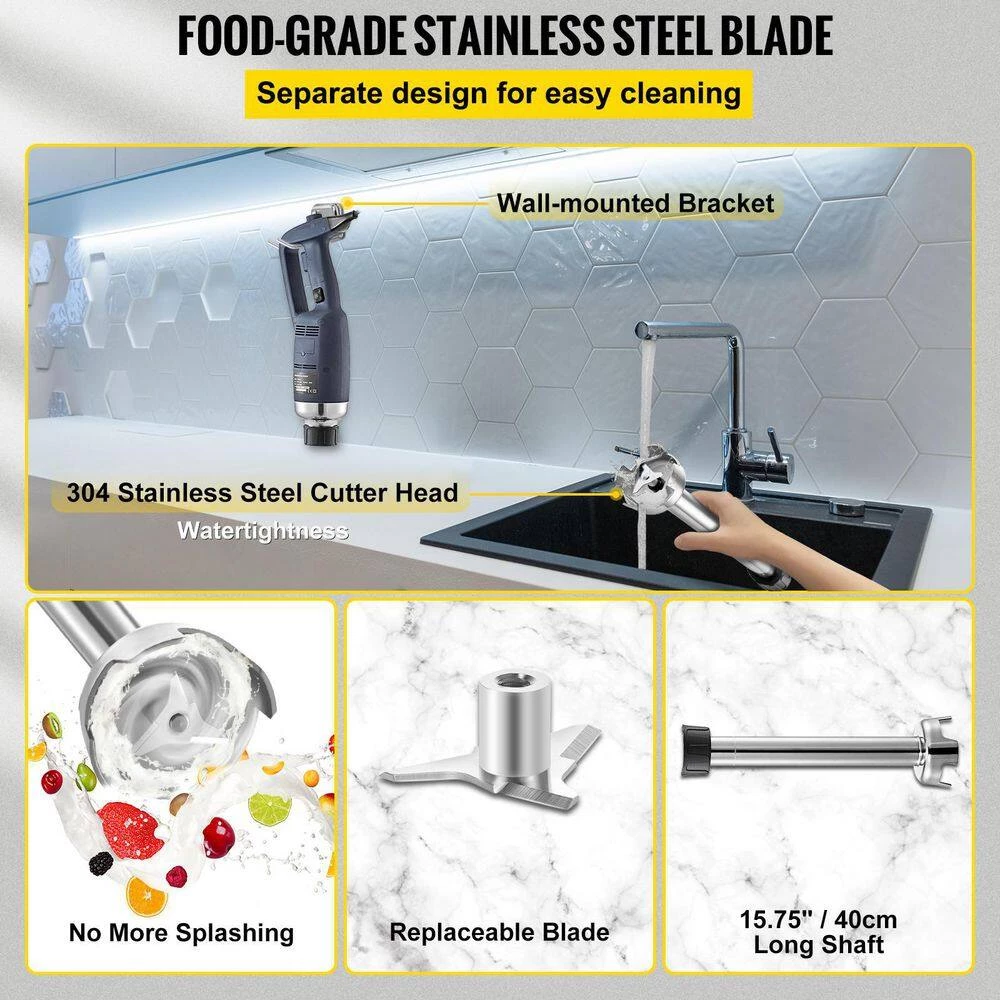 The VEVOR commercial immersion blender is suitable for commercial and home uses. It can quickly mix ingredients through a powerful motor and stainless steel blade. You can start it surely and speedily with three buttons. Its handle is easier to grasp, firmer, and more labor-saving. You can use our wall mount to hang it after cleaning.