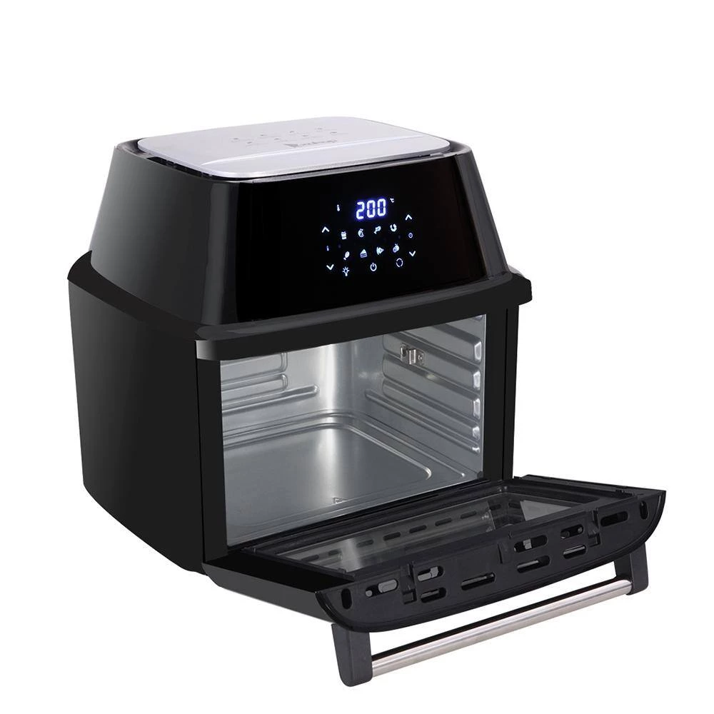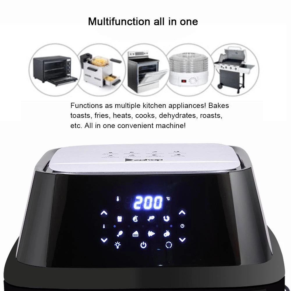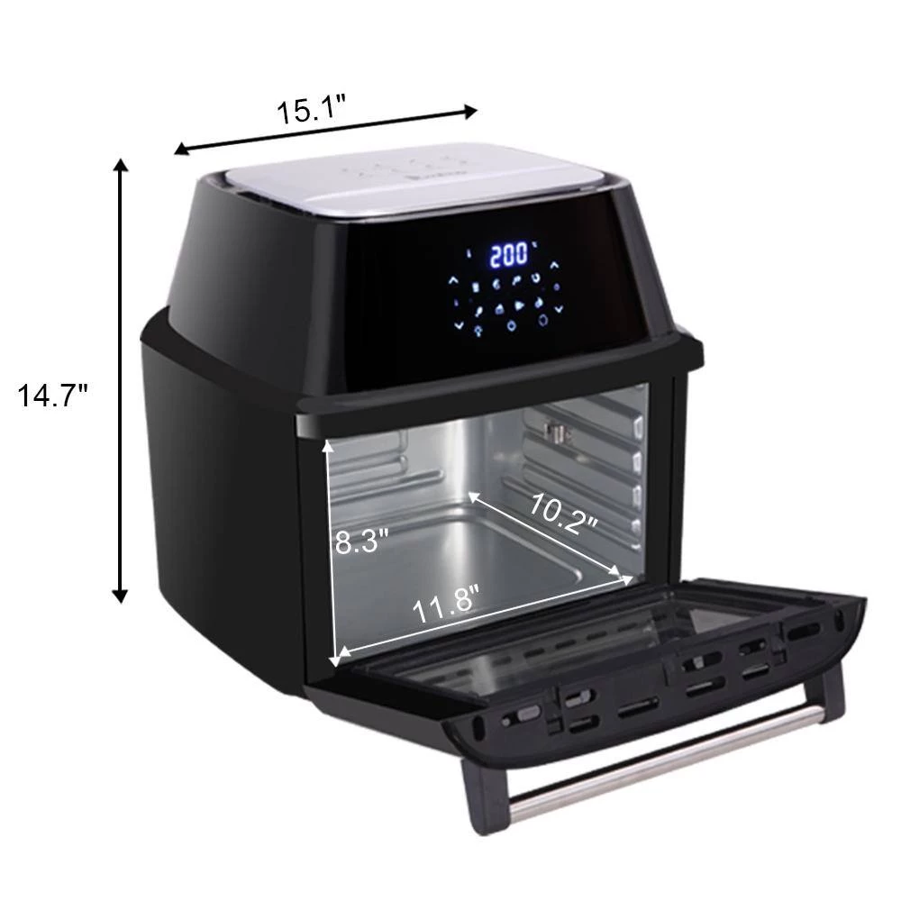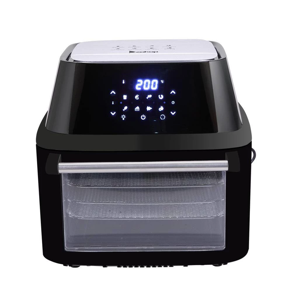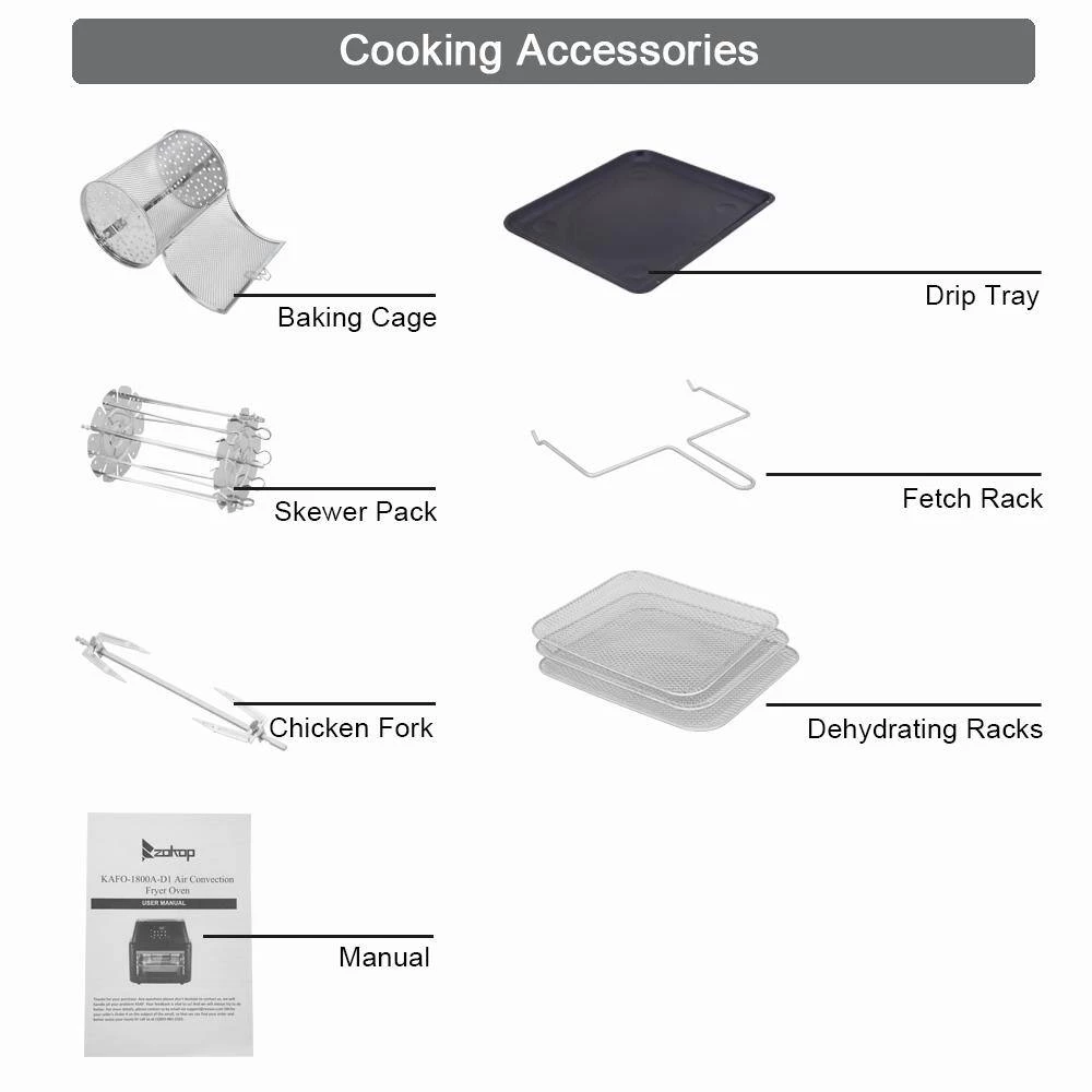 All in.-1-Air Fryer, Oven, Rotisserie, and Dehydrator With the Large Air Fryer you are on your way to healthy eating without sacrificing on taste or flavor. Cook, fry, grill and bake without the need for butter, oil or other unhealthy fats. With Rotisserie Chicken Fork, it could cook 3kgs( 6 lbs. ) Chicken with crisp outside and juice inside. Each Deluxe Air Fryer Oven comes with a fry pan (drip tray), three fry net, chicken fork , rotating basket , skewer rack , fetch rack. Double layer window with inside glass and outside transperant PC. Power Lighting inside, give you a good vision and cool touch.