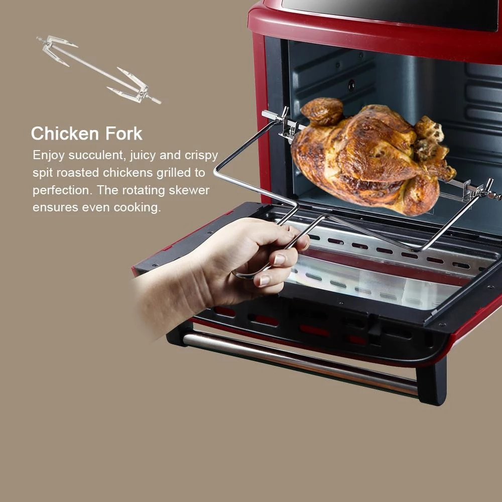 All-in-One Air Fryer, Oven, Rotisserie, and Dehydrator With the Large Air Fryer you are on your way to healthy eating without sacrificing on taste or flavor. Cook, fry, grill and bake without the need for butter, oil or other unhealthy fats. With Rotisserie Chicken Fork, it could cook 3kgs( 6pounds ) Chicken with crisp outside and juice inside. Each Deluxe Air Fryer Oven comes with a fry pan (drip tray), 3 fry net, chicken fork , rotating basket , skewer rack , fetch rack. Double layer window with inside glass and outside transperant-Piece. Power Lighting inside, give you a good vision and cool touch.